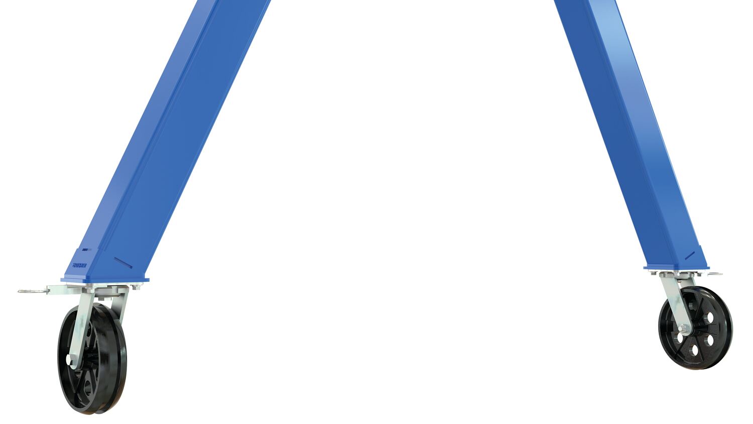 Steel Knockdown Fixed Gantry Crane with V-Groove Cast Iron Casters 20 Ft. 2000 Lb. Capacity BlueThe fixed height knockdown industrial steel Gantry cranes are uniquely designed to be disassembled when not in use for compact storage and easier transportation / shipping from one job site to another. Facilitate easy mobility from one area to another with the standard four (4) V-groove casters. These allow for quick movement and positioning adjustments. Features quick setup design. Do not move units while loaded. Painted blue finish. Designed for semi-permanent or permanent applications. Requires assistance from fork truck to set-up.