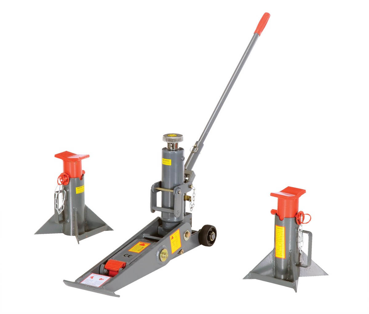 The manual Hydraulic Fork Truck jack is designed to raise fork trucks for maintenance. Features high-quality seals, chrome plated internal components, and rugged steel construction. This jack is manually raised by a hand pump lever and the lift height provides room needed to perform a variety of repairs. The removable handle and the compact size make it easy to maneuver and transport. Includes two (2) jack stands with holding pins for adjustable heights.
