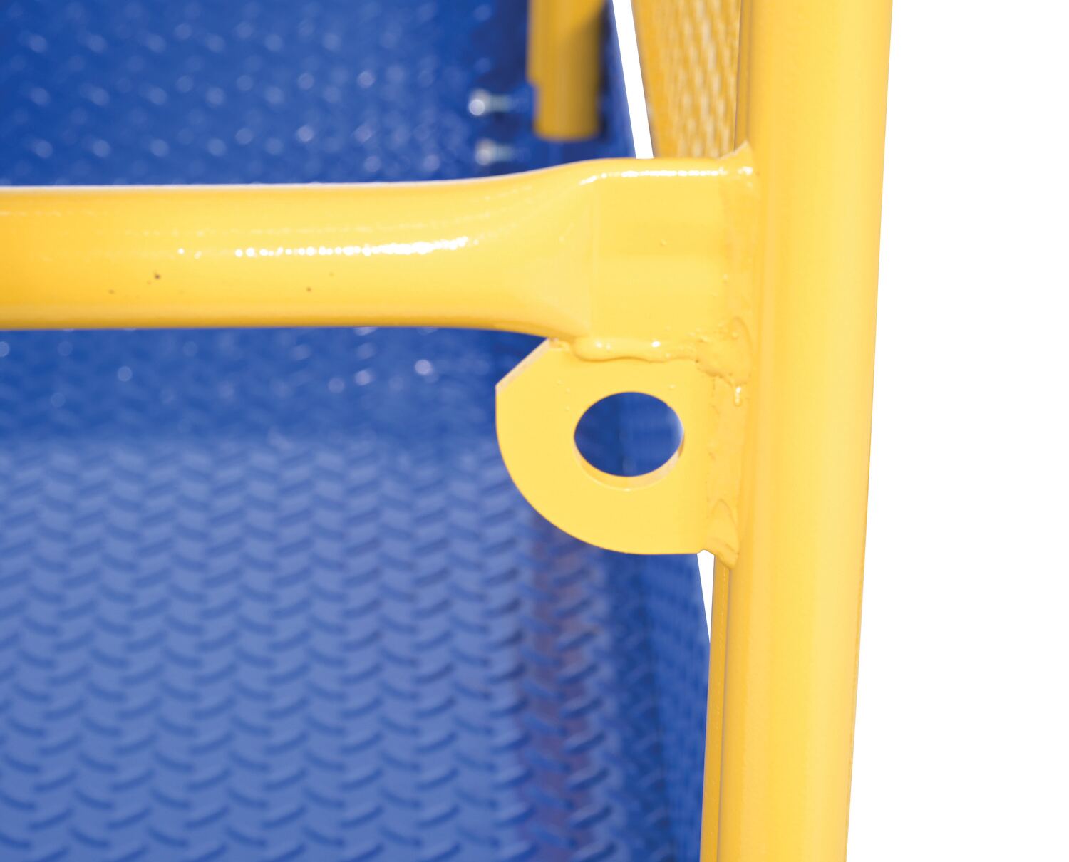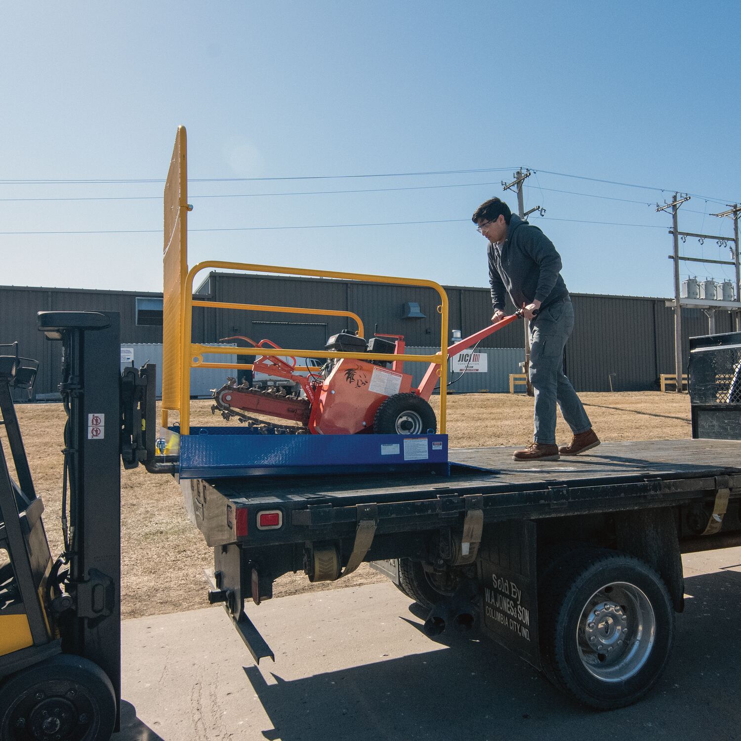 Steel Economical Portable Loading Platform with Handrails 54 In. x 54 In. 2000 Lb. Capacity BlueThis loading platform for fork trucks allows fork trucks to load/unload items into trucks and trailers. Maximum uniform weight capacity is dependent on fork truck capacity. Includes fold-down lip to help with transition. Side guard toe boards. Four (4) tie-down rings are included for securing equipment (tie downs not included). Diamond tread plate floor for extra traction. Handrails on two (2) sides, back mesh screen and chain to secure open end. safety strap (included) to secure platform to fork truck. Steel construction with blue baked-in powder-coated toughness.