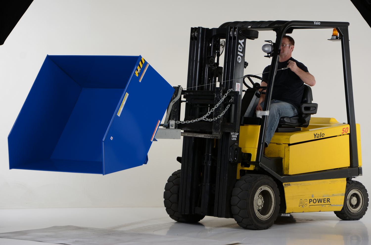 Steel Medium Duty Low Profile Self Dumping Hopper 1 Cubic Yard 4000 Lb. Capacity BlueThe Medium Duty Low Profile 90 degree self-dumping steel Hopper feature a full ninety (90) degree dump angle with a cushioned rubber bumper stop. The low profile design is essential for convenient loading. Dumping with a fork truck is quick and simple. A cable is pulled from the seat of the fork truck to dump the hopper. The unit returns to an upright and locked position when lowered to the ground. Fork pockets are 22" long and are capped on the end to allow for 90 degrees dump. The included safety restraint/chain must be securely attached to the lift truck carriage without slack. Models with same overall width may be stacked. For example, models H-25 may be stacked with H-50’s, the H-100’s can be stacked with H-150’s, while the H-200 hoppers can only be stacked with other H-200 series models. Never stack hoppers more than 3 high.