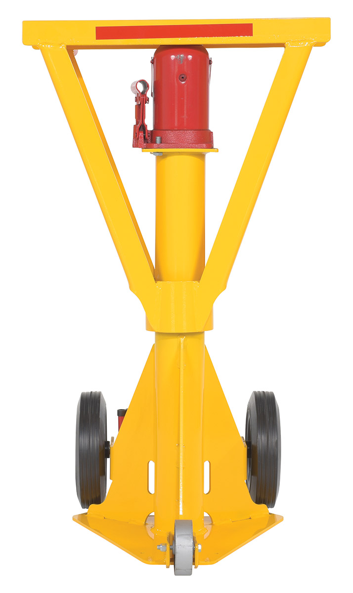 Steel Hydraulic Beam Trailer Stabilizing Jack 100,000 Lb. Static Capacity YellowTrailer stabilizing jacks are used to prevent up-ending of semi-trailers when they are not connected to a tractor during loading and unloading operations. Throughout the loading and unloading process it is always recommended to use two jacks, one on each side of the front of the trailer. The trailer must be situated on a flat, stable and improved (preferably concrete) surface, while the jack sits perpendicular to the underside of the trailer. Every jack is built of a high strength steel construction with a flush-type Zerk fitting for lubricating ACME screw. A yellow powder coat finish and a reflective collar for visibility at night are both included. Each jack meets OSHA regulations when used with wheel chocks. **The color of handles included with models may vary between red and black**.