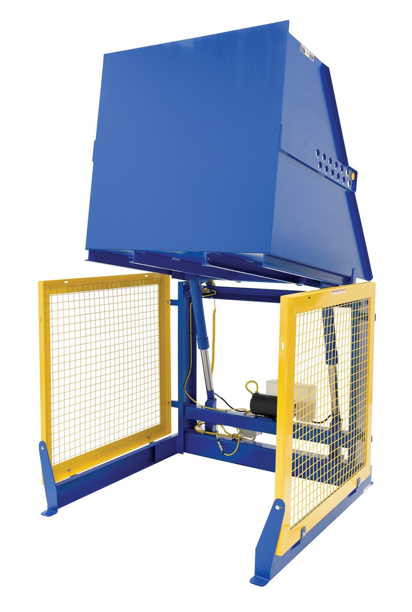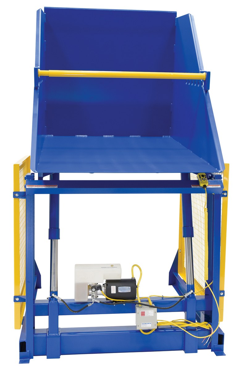 Steel Electric Hydraulic Box Dumper 48 In. Dump Height 2,000 Lb. Capacity BlueThe electric/Hydraulic box dumper is designed for controlled dumping of material from boxes, crates, and other types of containers. It is designed for pallet truck loading and unloading. The retaining bar adjusts to accommodate a wide range of container heights. Each dump height has a hold down range and an internal power unit with a hand held control standard. It has a heavy-duty welded steel construction with protective mesh side screens included.