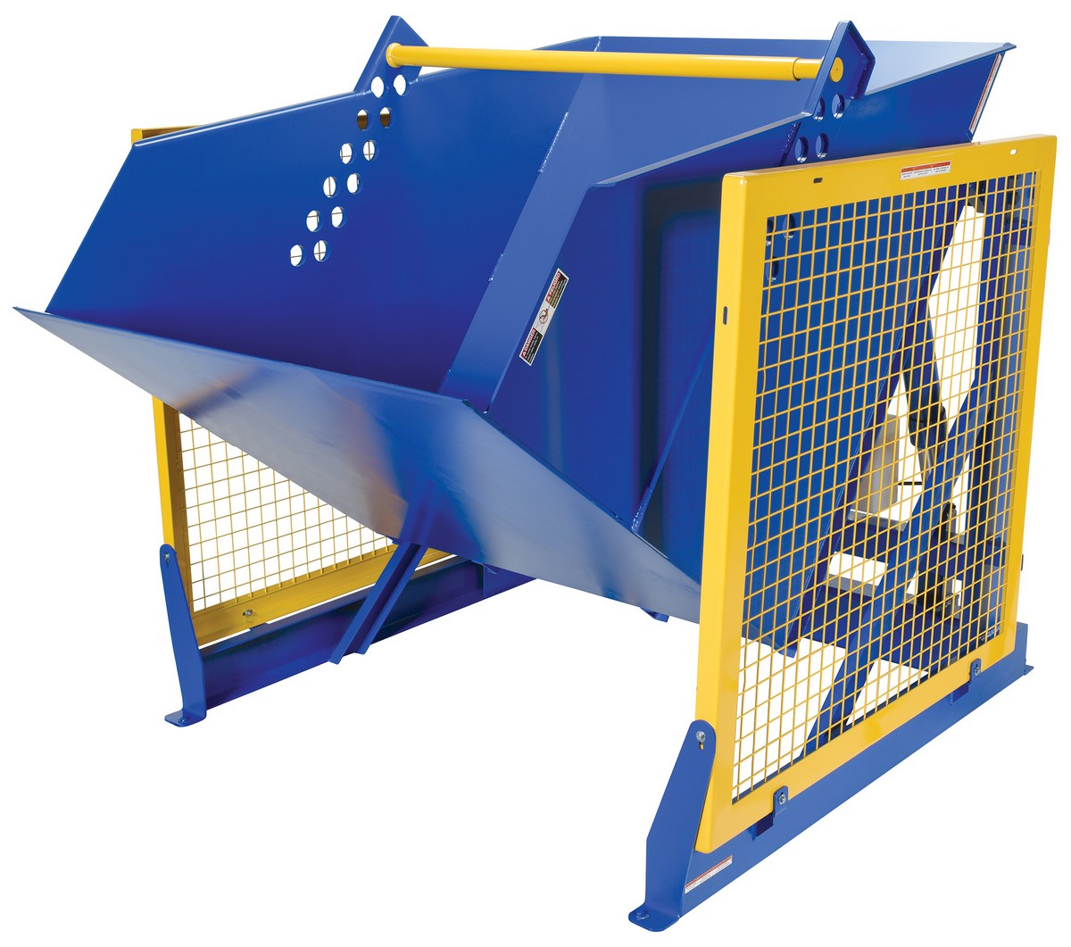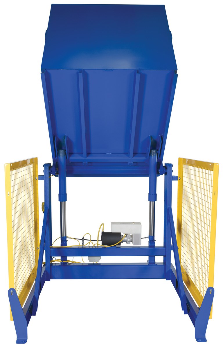 Steel Electric Hydraulic Box Dumper 48 In. Dump Height 4,000 Lb. Capacity BlueThe electric/Hydraulic box dumper is designed for controlled dumping of material from boxes, crates, and other types of containers. It is designed for pallet truck loading and unloading. The retaining bar adjusts to accommodate a wide range of container heights. Each dump height has a hold down range and an internal power unit with a hand held control standard. It has a heavy-duty welded steel construction with protective mesh side screens included.