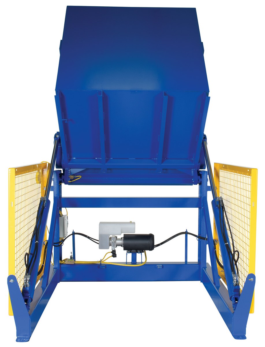 Steel Electric Hydraulic Box Dumper 36 In. Dump Height 6,000 Lb. Capacity BlueThe electric/Hydraulic box dumper is designed for controlled dumping of material from boxes, crates, and other types of containers. It is designed for pallet truck loading and unloading. The retaining bar adjusts to accommodate a wide range of container heights. Each dump height has a hold down range and an internal power unit with a hand held control standard. It has a heavy-duty welded steel construction with protective mesh side screens included.