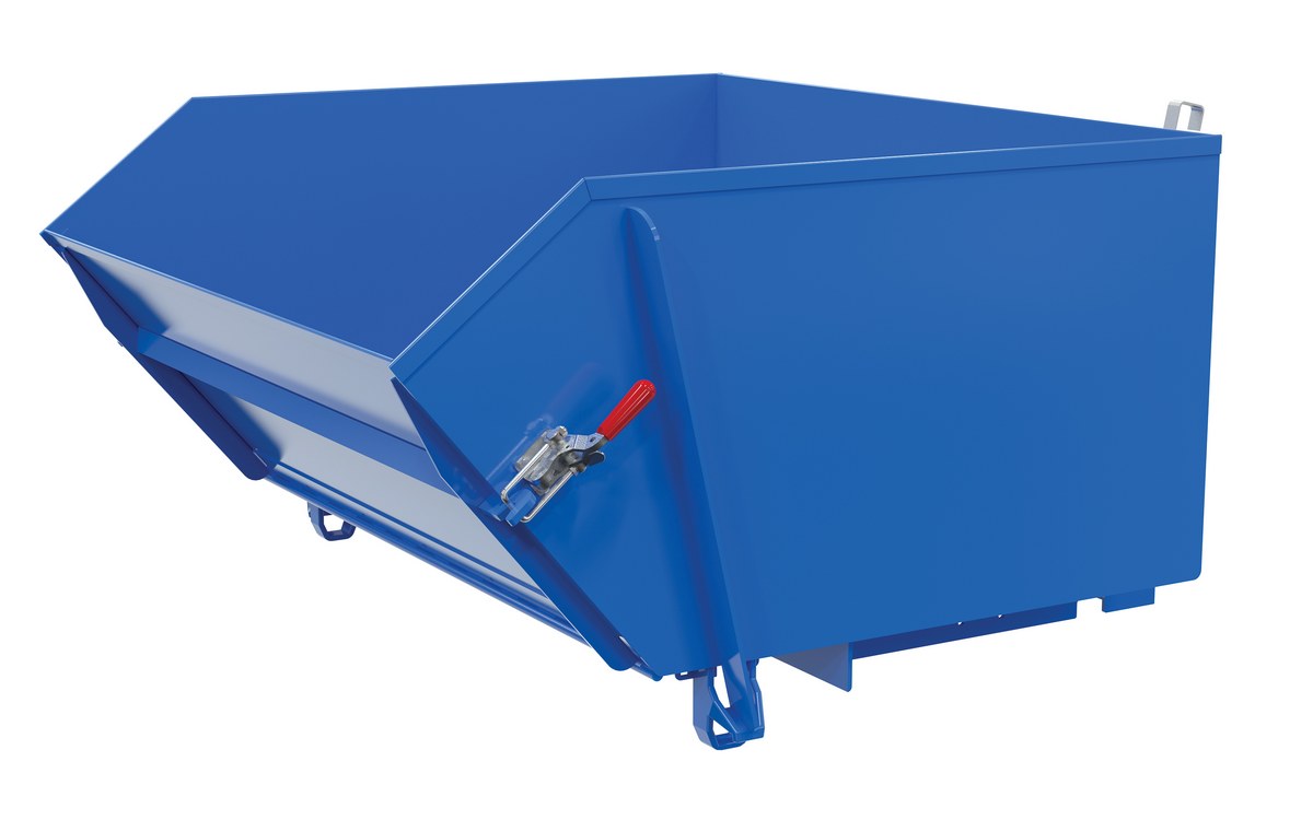Steel Medium Duty Self Dumping Hopper with Fold Down Front 1 Cubic Yard 4000 Lb. Capacity BlueThis self-dumping steel Hopper has a low-profile design with a drop-down front for easy shovel loading. The manual hand latches are used to secure the drop-down front. The manual pull-cable is used to dump the hopper from the seat of a fork truck, the dumper returns to the upright position when lowered to the ground.