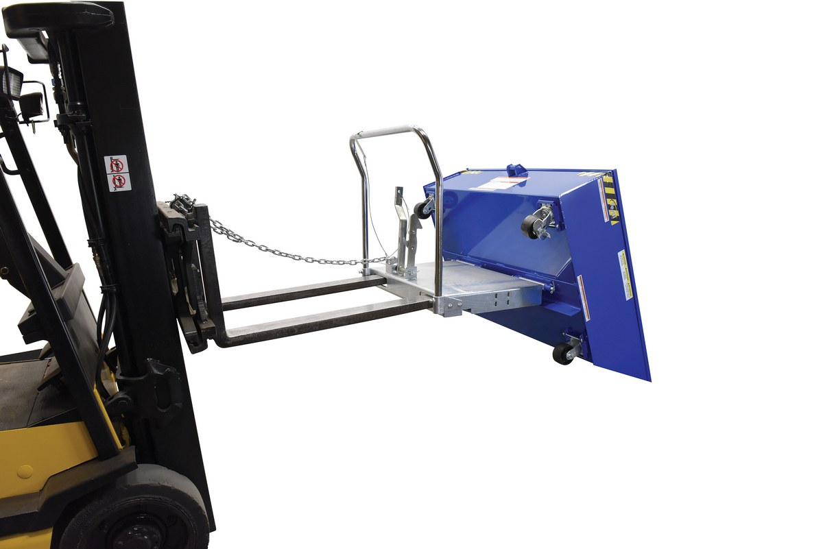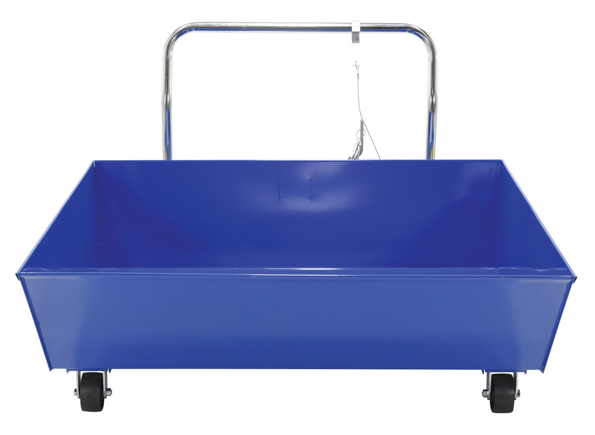 Steel Low Profile Parts Hopper 1/2 Cubic Yd. 2000 Lb. Capacity BlueThis unique Low Profile parts Hopper has been designed to function as a parts hopper that may be dumped with the assistance of a fork truck. The low profile design allows the hopper to be placed underneath machinery as a catch basin for parts. The newly designed hopper reduces the hazards, inconveniences, and time associated with collecting parts off the floor. Unit rolls smoothly on casters and includes a removable push handle. Once the material is dumped, the hopper will return to the locked position when lowered to the ground. The included safety restraint should be properly secured to a fork truck before dumping.