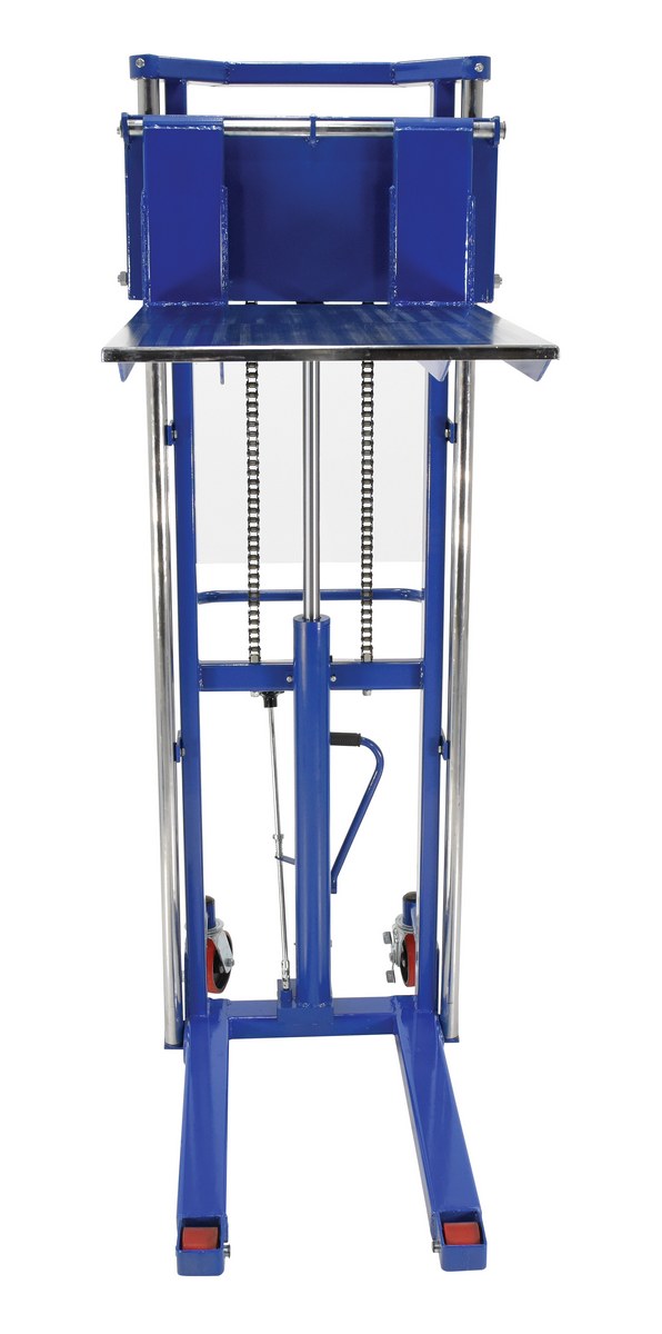 Steel Portable Foot Pump Hefti-Lift 51 In. x 79-3/8 In. 1500 Lb. Capacity BlueThe Hefti-Lift is a user friendly, portable hydraulic lift. The lift provides reliable, power lifting when moving and positioning loads. The non-slip chain is used for accurate positioning while the unit rolls easily on two rigid and two swivel poly-on-steel casters that includes a foot operated brake. The lift is all welded construction with a chrome platform and uprights. Not for use with pallets.