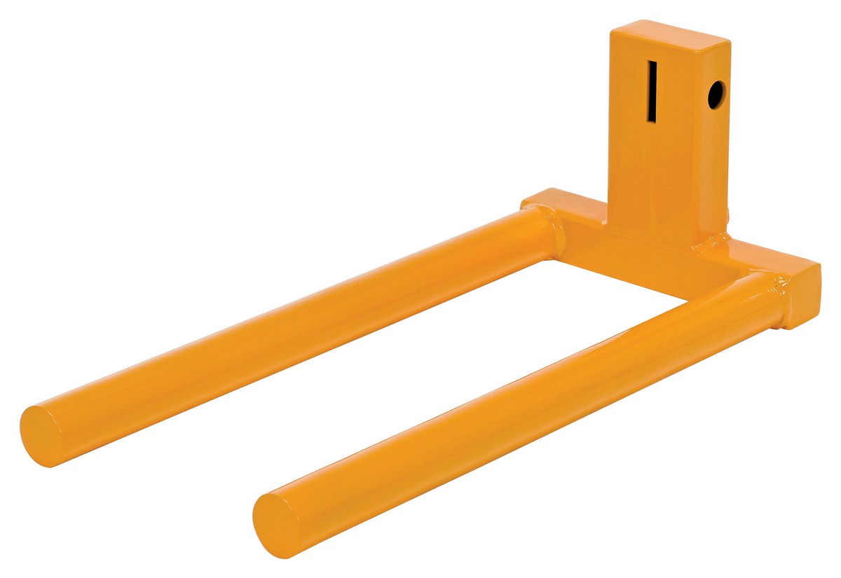 The double spindle attachment is designed of a strong construction for lifting rolls of material and other hollow cylinder objects. A simple installation allows the user to obtain immediate use and diminishes the grind of bending and lifting heavy objects. A bright yellow finish promotes safety and visibility while transferring units.