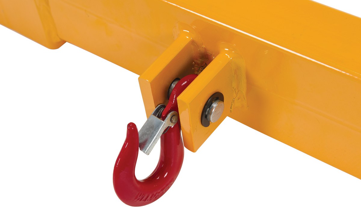 The hook attachment is designed of a strong construction for lifting awkward heavy products. A simple installation allows the user to obtain immediate use of the hook and start maneuvering products. A bright yellow finish promotes safety and visibility while transferring units.