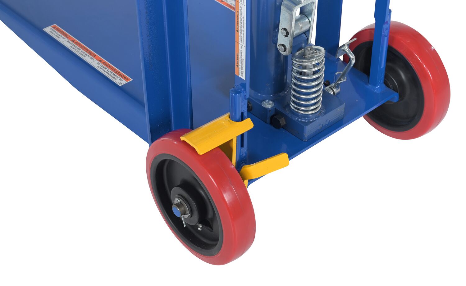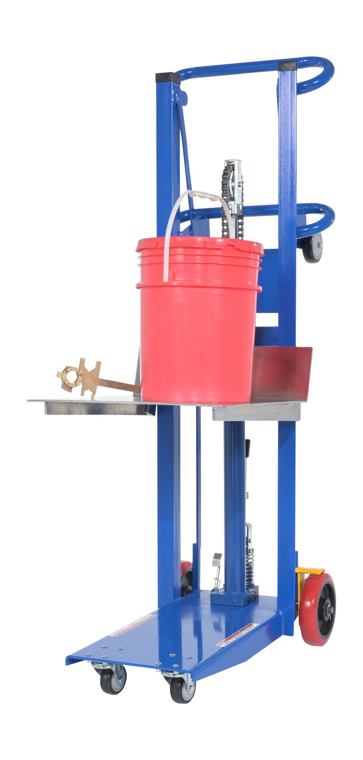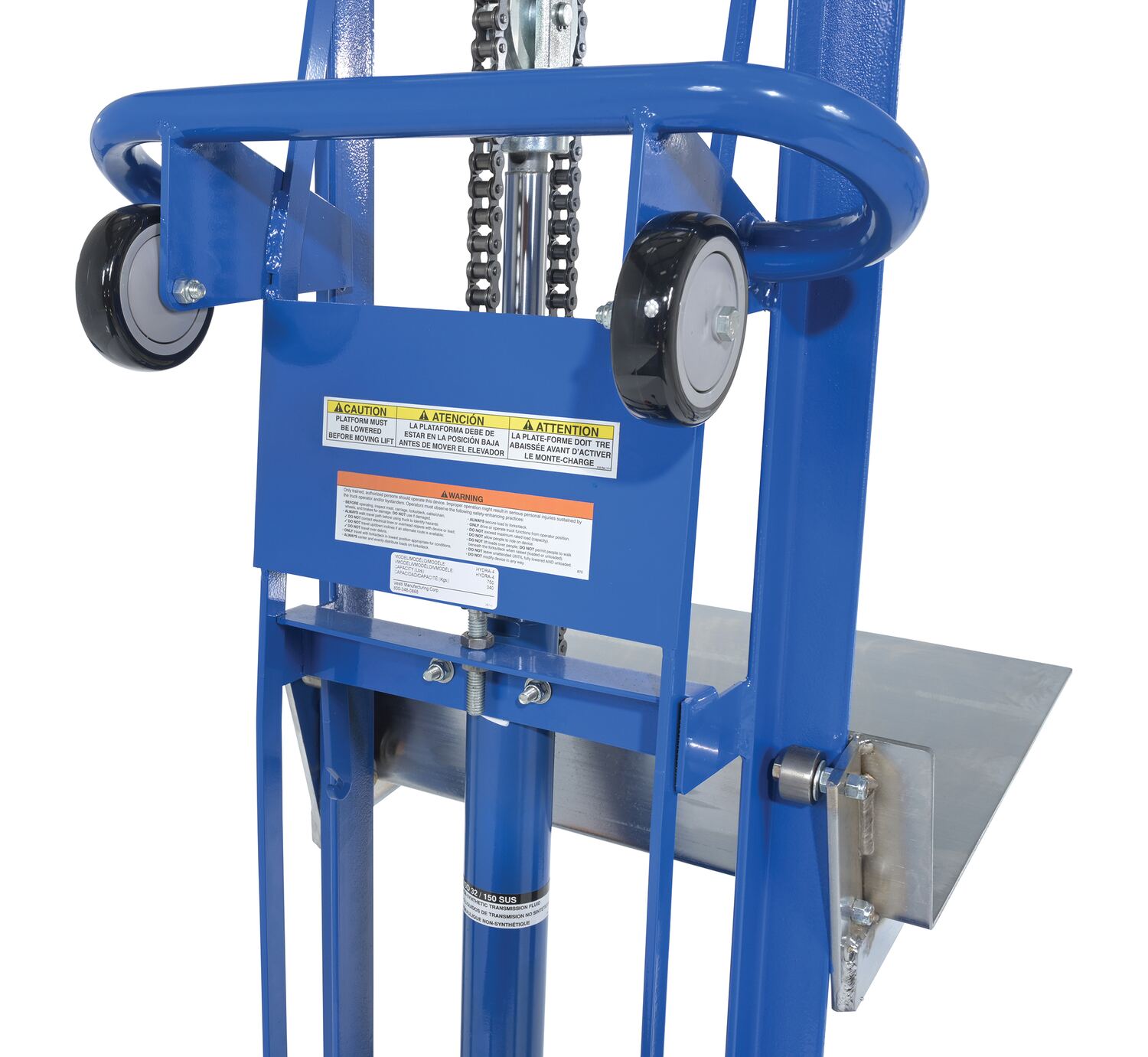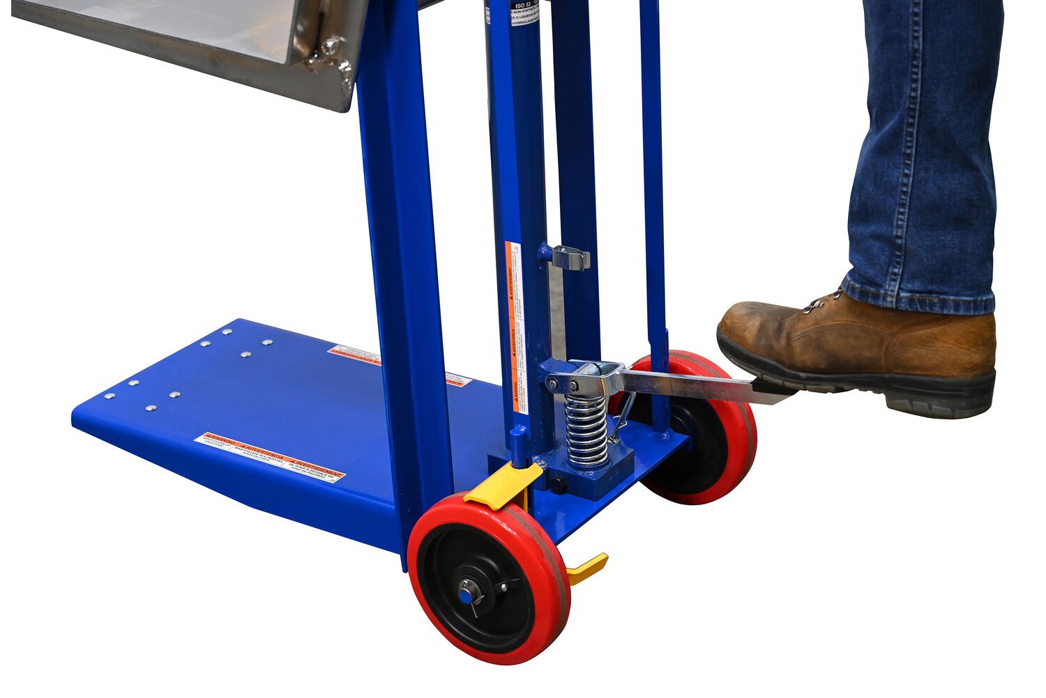 Steel Hydra Lift Cart 33-3/4 In. x 20-1/2 In. 750 Lb. Capacity BlueThe hydra cart transports loads in the lowered position and maneuver work materials to an ergonomic height, which is ideal in compact work areas. It's safe and easy for one person handling of loads and an efficient way to unload heavy objects from semi-trailers. The rugged steel construction allows for many years of service. The dependable precision built hydraulic system is activated by an easy action foot lever. The additional rollers on the handle make loading into a delivery truck easy. A single wheel brake comes standard.