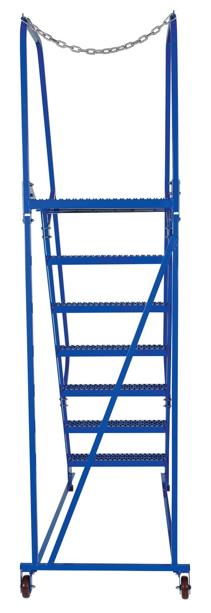 Steel Maintenance Ladder 58 Degree 7 Grip Strut 24 In. Step Width 350 Lb. Capacity BluePortable maintenance ladder for use around a variety of stores and inventory rooms. Constructed of square tubing framework, which handles uniform capacities up to 350 lbs. hand railing provides user safety while ascending or descending the unit. Distance between steps is 10". Powder coated finish for baked in added toughness.