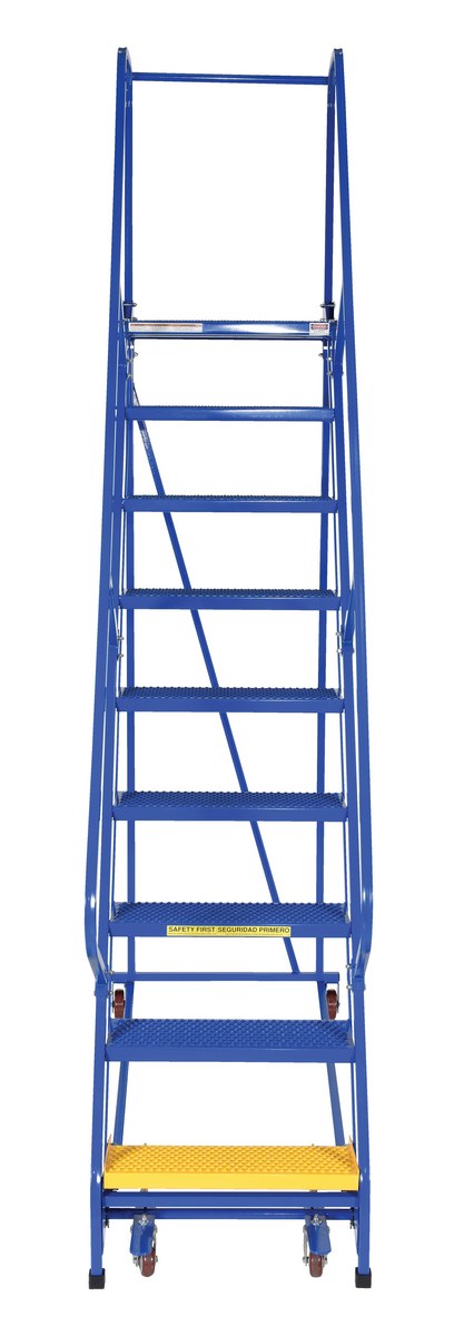 Steel Standard Slope Ladder 58 Degree 9 Perforated 23-9/16 In. Step 350 Lb. Capacity BlueThe standard slope ladder is a portable warehouse ladder for every-day use applications. Perforated steps, handrail included, welded square tubular steel construction with powder-coat blue finish. Rubber feet provided for floor protection. Unit has bottom step lock casters for safe use when climbing.
