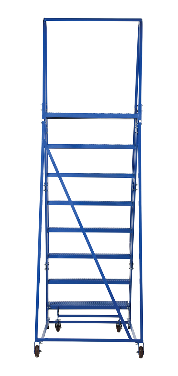 Steel Standard Slope Ladder 58 Degree 8 Perforated 30-1/4 In. Step Width 350 Lb. Capacity BlueThe standard slope ladder is a portable warehouse ladder for every-day use applications. Perforated steps, handrail included, welded square tubular steel construction with powder-coat blue finish. Rubber feet provided for floor protection. Unit has bottom step lock casters for safe use when climbing.