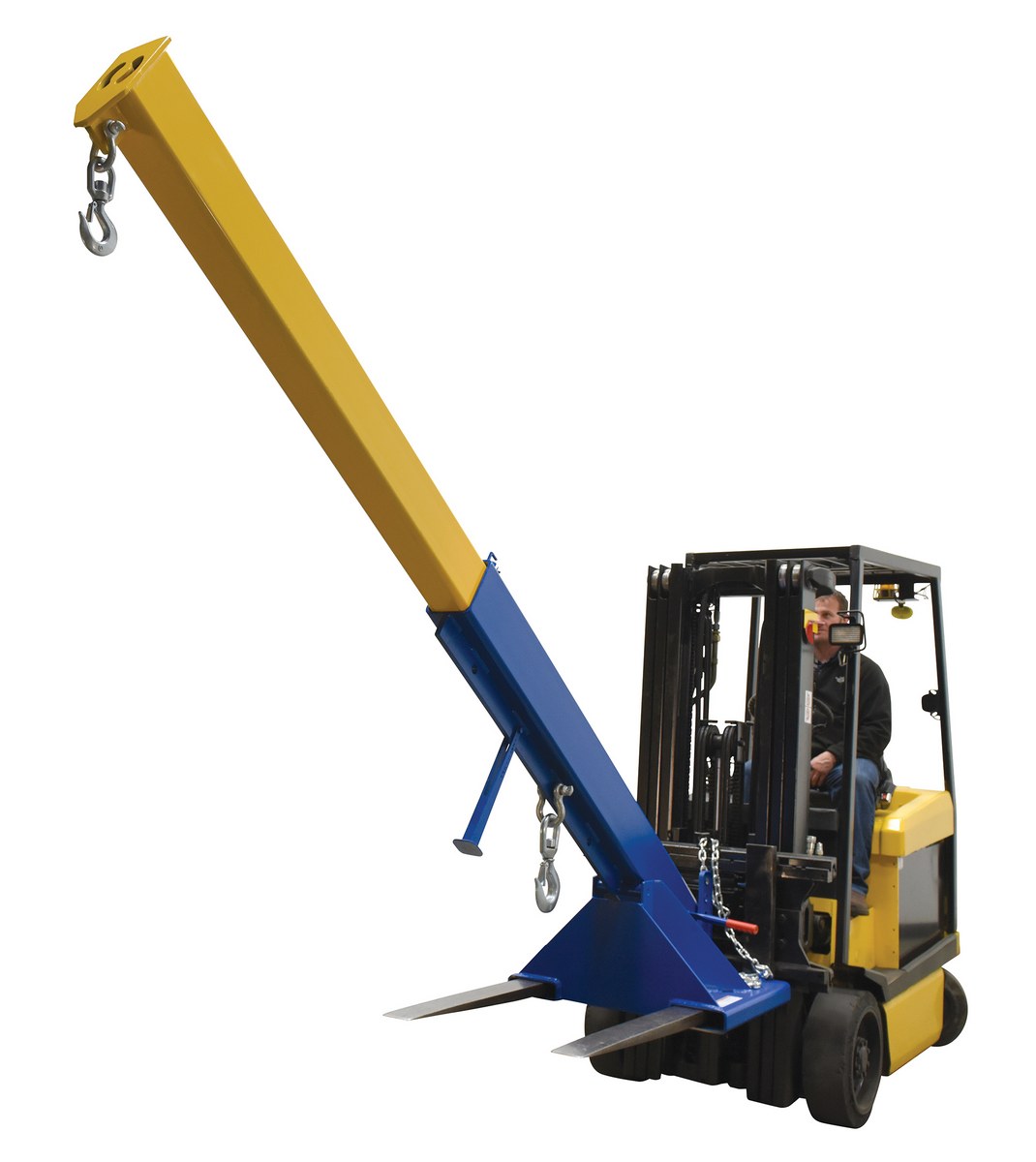 Unique performance, convenience, and safety features are built into every lift master boom. Fabricated from structural steel with welding to meet AWS creates a rugged and durable boom that will provide long term service. A safety restraint secures the boom to the fork truck for safe operation. Includes two (2) lifting hooks.
