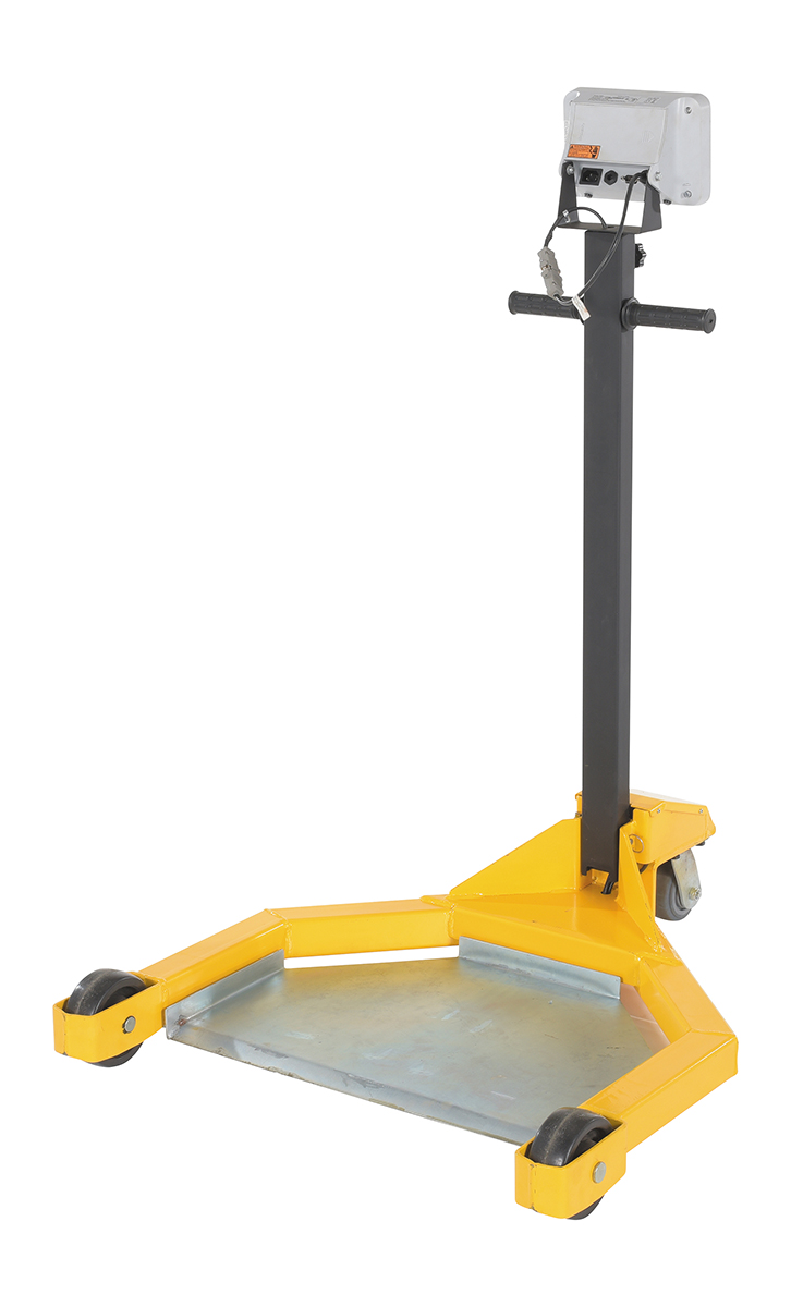 Steel Low Profile Drum Dolly with Scale 38-1/2 In. x 31-1/2 In. x 49-1/4 In. 800 Lb. Capacity Black / YellowWhy bother taking the time to weigh drums at a designated location when you can do it on the go. The low profile drum scale allows the user to weigh the drums while they are being transported. Simply maneuver the drum onto the platform and a read-out of the weight will appear on the screen located near the handle of the dolly. Powder coated black and yellow for increased toughness during daily use. Poly casters are included for simple and a smooth rolling across a variety of surfaces. When not in use, the handle folds down onto the loading platform for a simple storage.