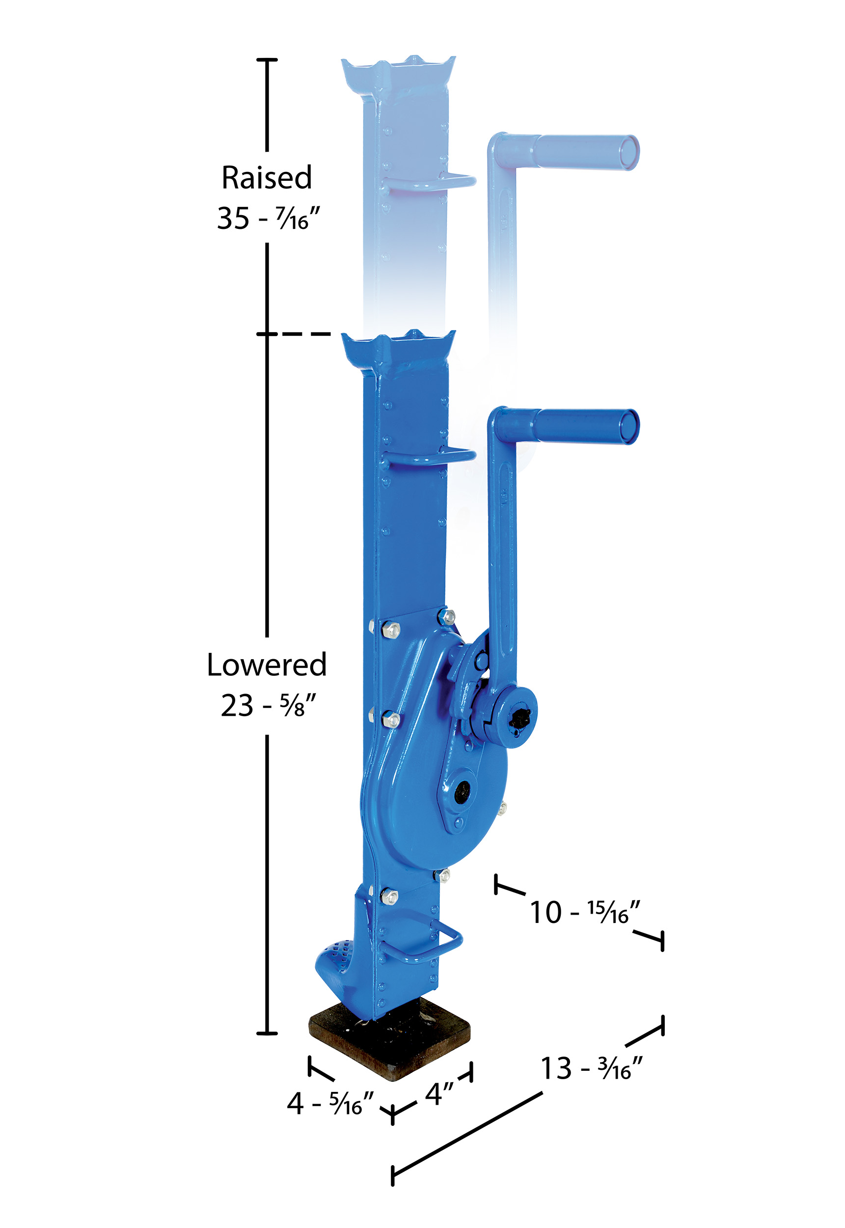 Mechanical Machinery Jack 13-3/16 In. x 10-15/16 In. x 35-7/16 In. 3000 Lb. Capacity BlueThe mechanical machinery jack is good for repairing vehicles, lifting trucks, railway maintenance, construction, mining, and agriculture. Compact design with collapsible lever offers easy operation and simple maintenance. A self locking, anti-kickback operating lever reduces injuries. Standard features include: folding handle, two carrying handles and a large base plate. Lifting and lowering speed is controllable. No seals to leak. Will not drift down even after an extended period of time.