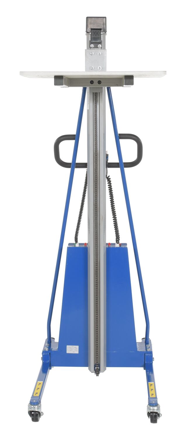 Steel DC Powered Work Positioner 35-1/2 In. x 23-5/8 In. x 79-1/2 In. 550 Lb. Capacity BlueThe Vestil work positioner takes the strain out of any lifting job! While many competitor models are big and bulky, the Vestil positioner is specifically built to go down narrow aisles and around confined spaces. With a platform height that is adjustable with a DC powered lift; getting to the perfect height is quick and easy. Two (2) 3" swivel load casters and two (2) 5" total locking swivel steering polyurethane casters standard. Includes two (2) 12V AGM batteries with an integral battery charger.