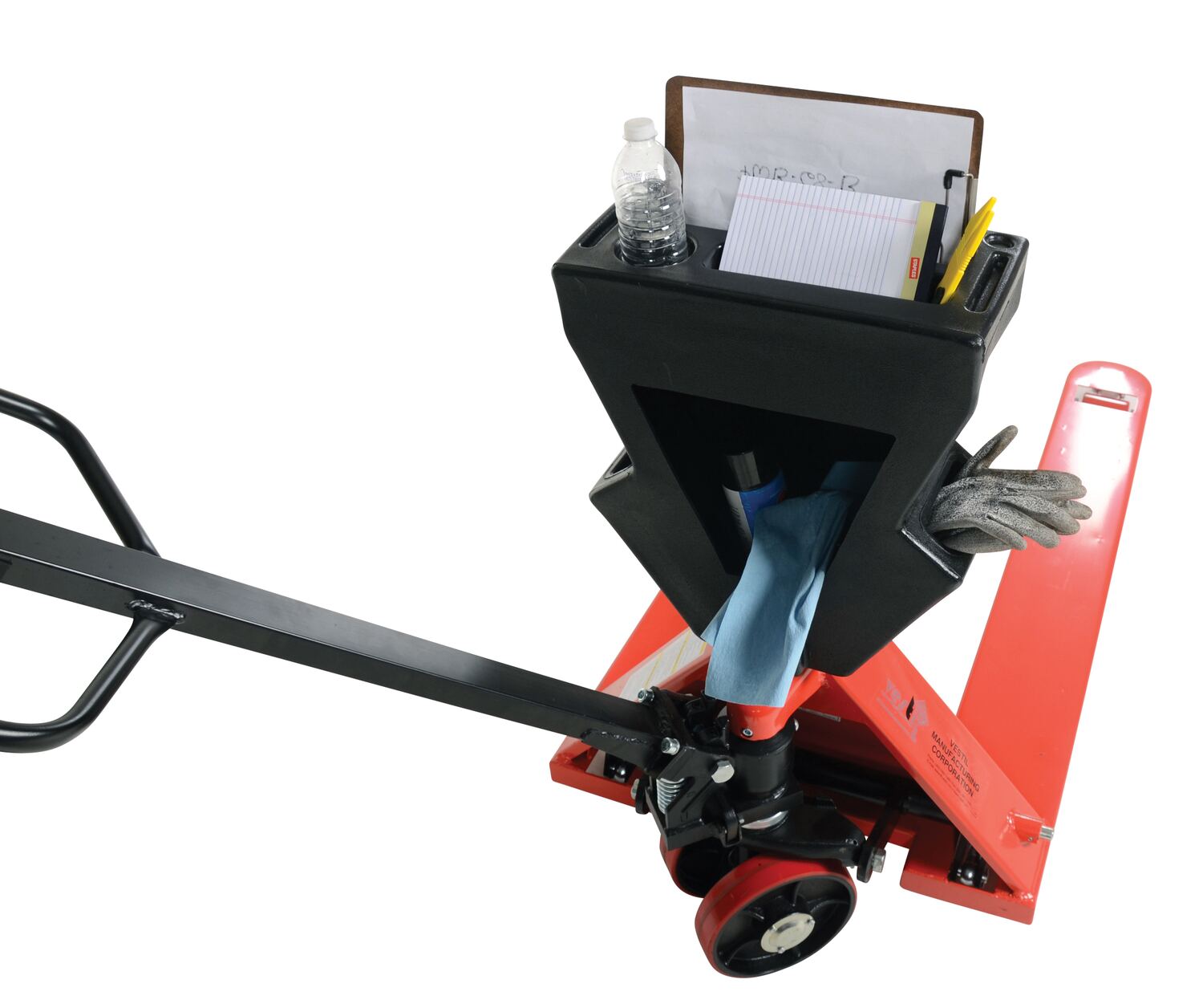 The pallet truck caddy is an economical product that will convert a standard pallet truck into a portable workstation in minutes. It has been designed with user efficiency and convenience in mind. It easily attaches to virtually any type of pallet truck with hardware included. Features beverage holder, tool pockets, pen and pencil tray, and clipboard holder.