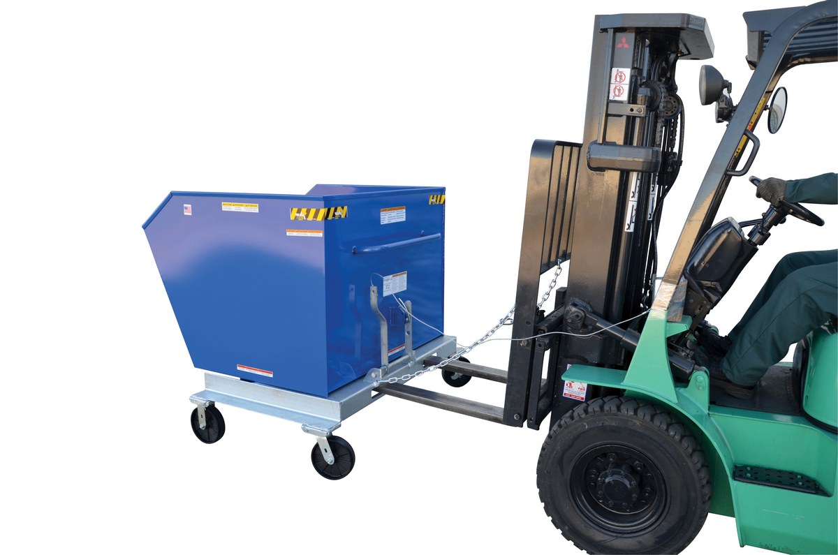 A portable steel Hopper makes handling waste and bulk material safer and more convenient. Fork truck entry openings are designed to move hopper over rough terrain. Foot operated caster lock is included. Unit tilts with assistance from operator while seated on fork truck. Handle for transporting. The included safety restraint should be properly secured to a fork truck before dumping. Welded construction makes them durable. Blue baked-in powder-coated toughness with galvanized base.