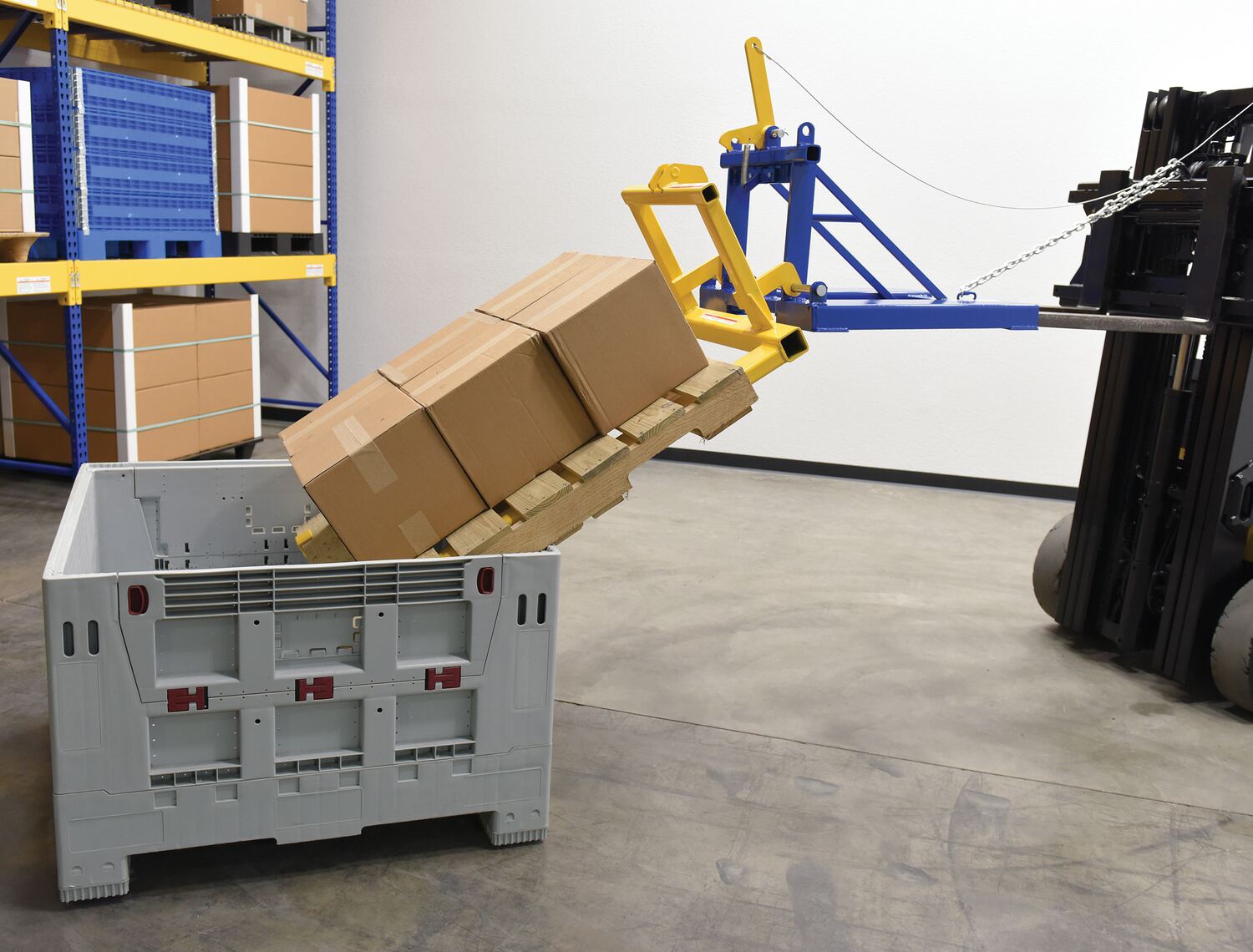 Steel Pallet Dumper/Retainer 52 In. Long Forks 2000 Lb. Capacity BlueDump loaded pallets easily without leaving the seat of your fork truck with the all welded steel pallet dumper/retainer. Unit slides onto forks and is secured by a safety restraint. Two (2) retainers hold the pallet in place while dumping the contents into a hopper or dumpster. Once the retainers have cleared the opposite end of the pallet, raise the forks and the retainers will hold the pallet on the forks. Lift the pallet to the dumping height and rest the pallet on the edge of the dumpster. Pull the chain, releasing the fork carriage, allowing the pallet to tilt and dump the load into the hopper or dumpster. When finished, simply lower to the ground until the carriage latches.