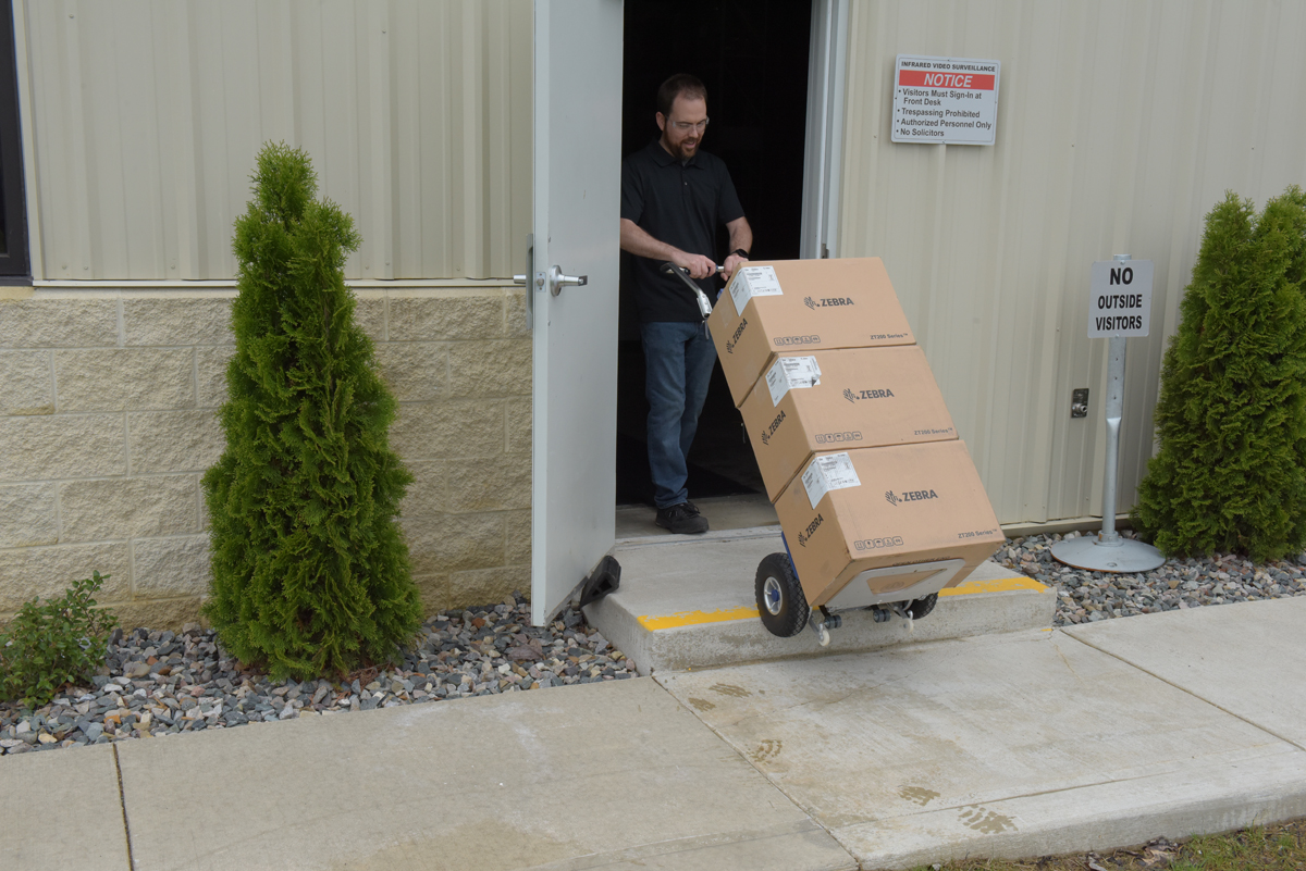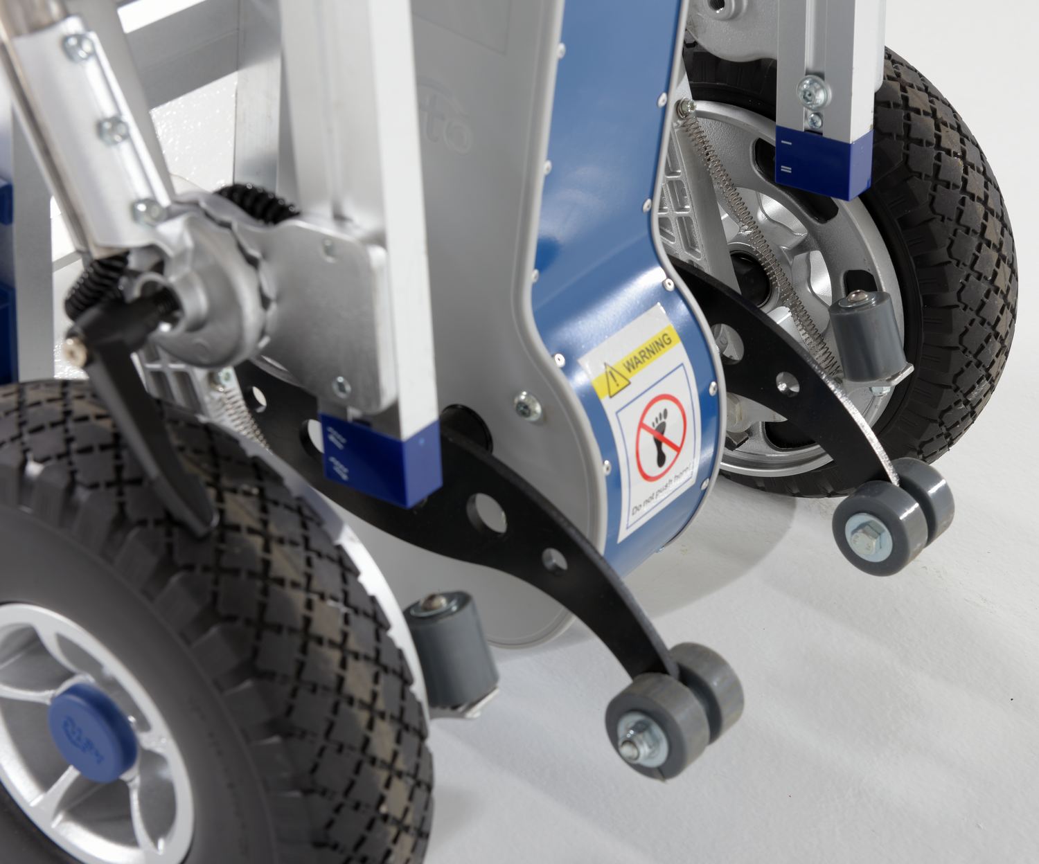 When objects are required to be moved up or down flights of stairs, the powered stair climber is the perfect asset. With the large ergonomic handle and tall upright aluminum alloy structure, a single user can transport goods with ease. A wide platform base gives the user the opportunity to transfer a variety of items whether they are heavy, light, large or small. When transferring goods down a set if stairs, the brake is automatically applied to ensure safety and consistent speed of movement. The powered design increases user safety and minimizes the labor associated with moving awkward items. This powered stair climber has two raise/lowering speeds. When not in use, the cart folds into a very compact design that is perfect for transporting in vehicles or storing away in closets. Large polyurethane wheel make traversing over a variety of surfaces as simple as can be.
