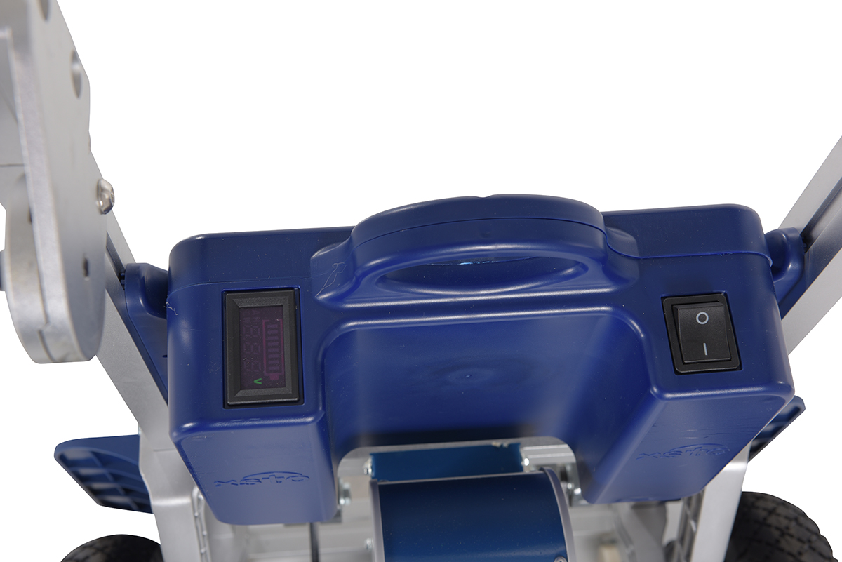Aluminum Powered Stair Climber 22 In. x 21 In. x 61 In. 350 Lb. Capacity BlueWhen objects are required to be moved up or down flights of stairs, the powered stair climber is the perfect asset. With the large ergonomic handle and tall upright aluminum alloy structure, a single user can transport goods with ease. A wide platform base gives the user the opportunity to transfer a variety of items whether they are heavy, light, large or small. When transferring goods down a set if stairs, the brake is automatically applied to ensure safety and consistent speed of movement. The powered design increases user safety and minimizes the labor associated with moving awkward items. This powered stair climber has two raise/lowering speeds. When not in use, the cart folds into a very compact design that is perfect for transporting in vehicles or storing away in closets. Large polyurethane wheel make traversing over a variety of surfaces as simple as can be.