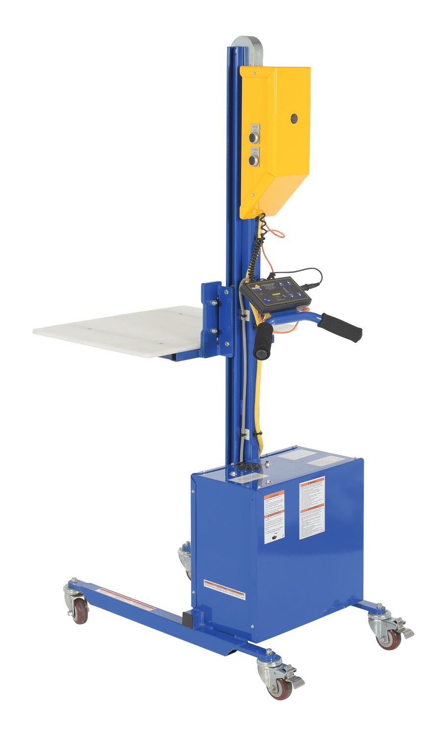 Steel DC Powered Quick Lift with Auto Height Indexer 175lb Capacity BluePowered quick lift units transport and position loads quickly and efficiently. Featuring a low profile design with dual push handles for maneuvering in narrow aisles and confined spaces. The auto height indexer lets the platform be unadjusted to the most suitable height. When unloading many boxes, as one box is taken off of the platform, the height of the platform automatically re-adjusts back to the set proper height. This minimizes bending and keeps the user in a more ergonomic position throughout the process. Unit is powder coated for baked in added toughness.