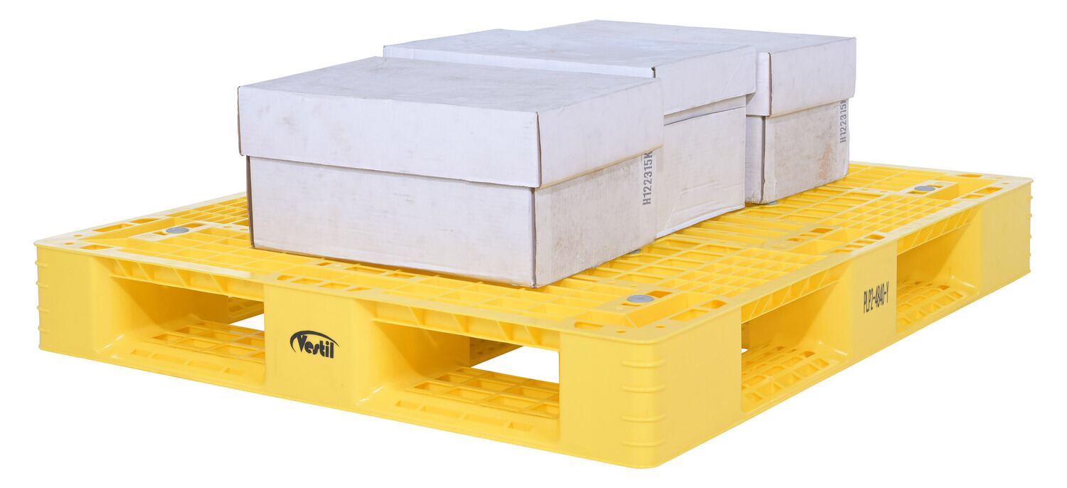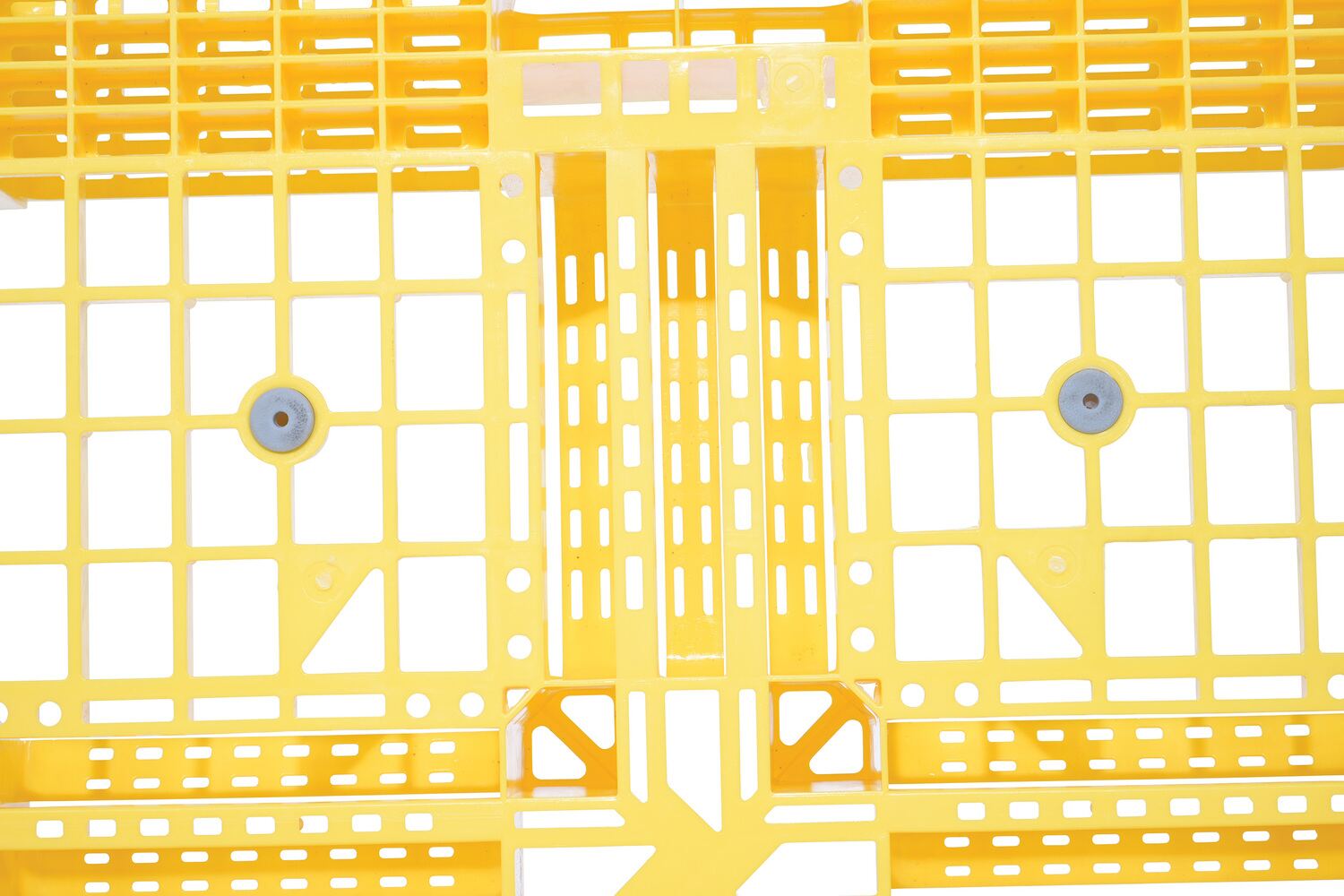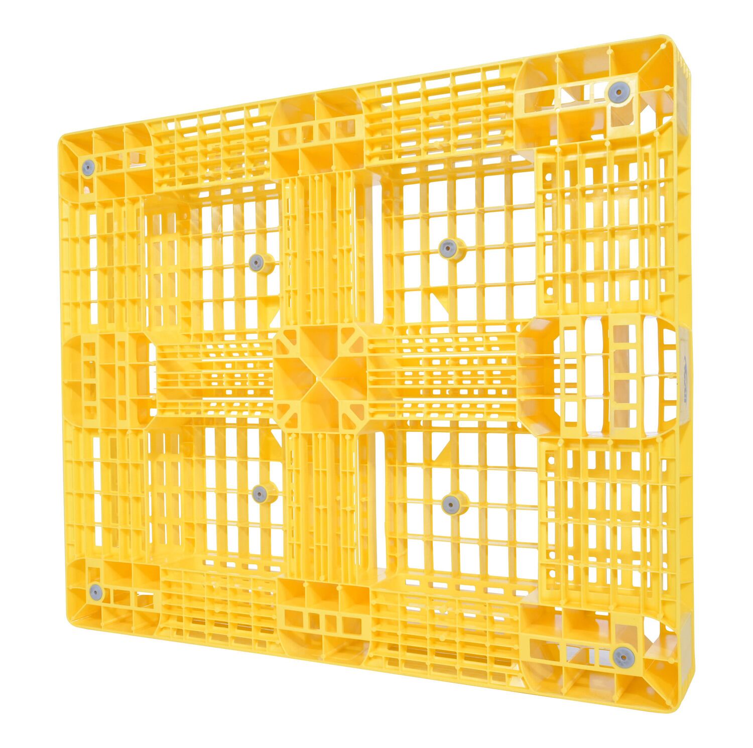High Density Polyethylene Pallet 39-3/8 In. x 47-3/8 In. x 6 In. 8000 Lb. Capacity YellowPlastic pallets are stackable for efficient storage. Made of high-density virgin polyethylene for long life. Plastic pallets are maintenance free and safer to handle than wooden pallets. Features a four-way entry and serrated deck with holes for drainage. Plastic pallets are ideal for export, pharmaceutical, medical, and food applications.