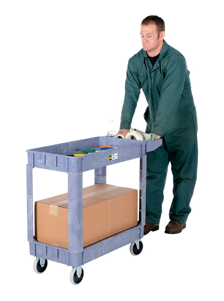 Plastic Utility Service Cart 2 Shelves 40 In. x 18-1/2 In. x 33-1/2 In. 550 Lb. Capacity GrayThis plastic utility service cart is constructed from durable yet lightweight structural foam plastic. Choose the two (2) shelf design to accommodate your application. Deep lips prevent parts from rolling off. Ideal for mail rooms, shipping docks, grocery stores, warehouses, and inventory rooms.
