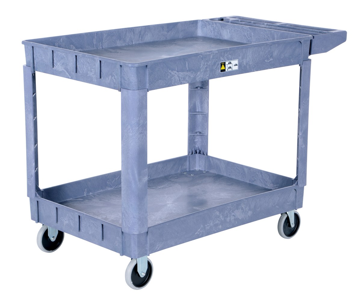 Plastic Utility Service Cart 2 Shelves 45 In. x 25-1/2 In. x 33-1/2 In. 550 Lb. Capacity GrayThis plastic utility service cart is constructed from durable yet lightweight structural foam plastic. Choose the two (2) shelf design to accommodate your application. Deep lips prevent parts from rolling off. Ideal for mail rooms, shipping docks, grocery stores, warehouses, and inventory rooms.