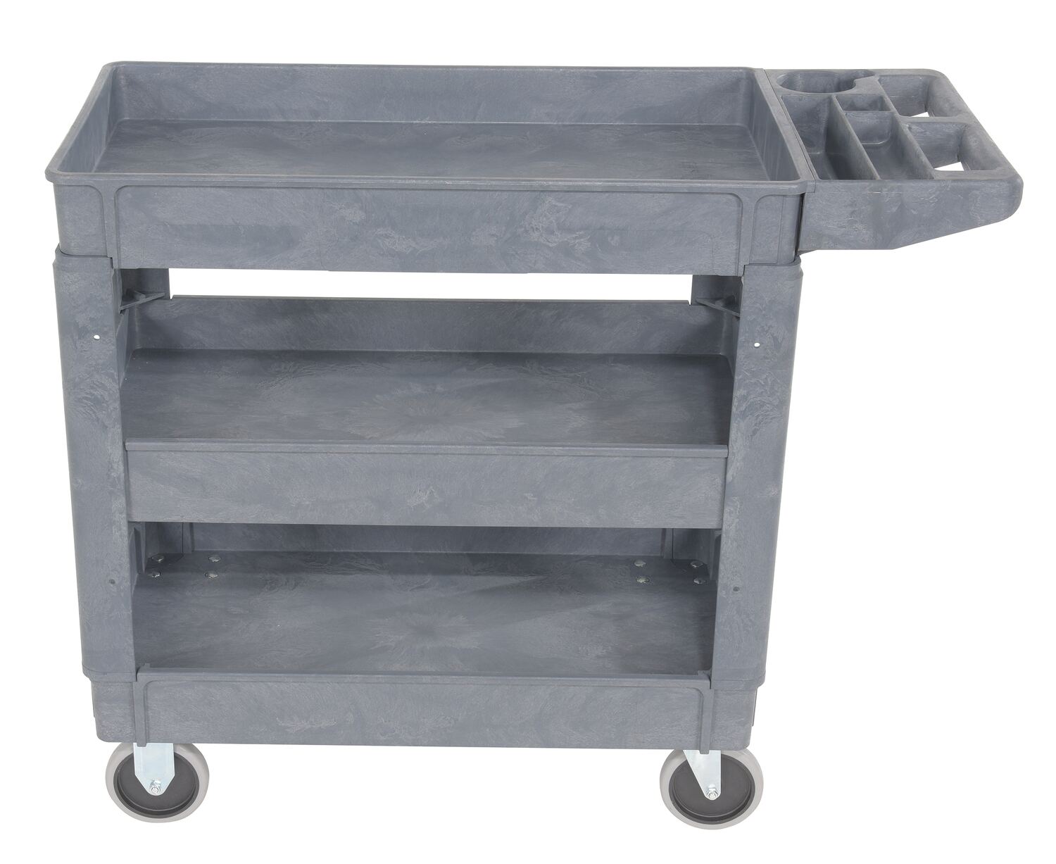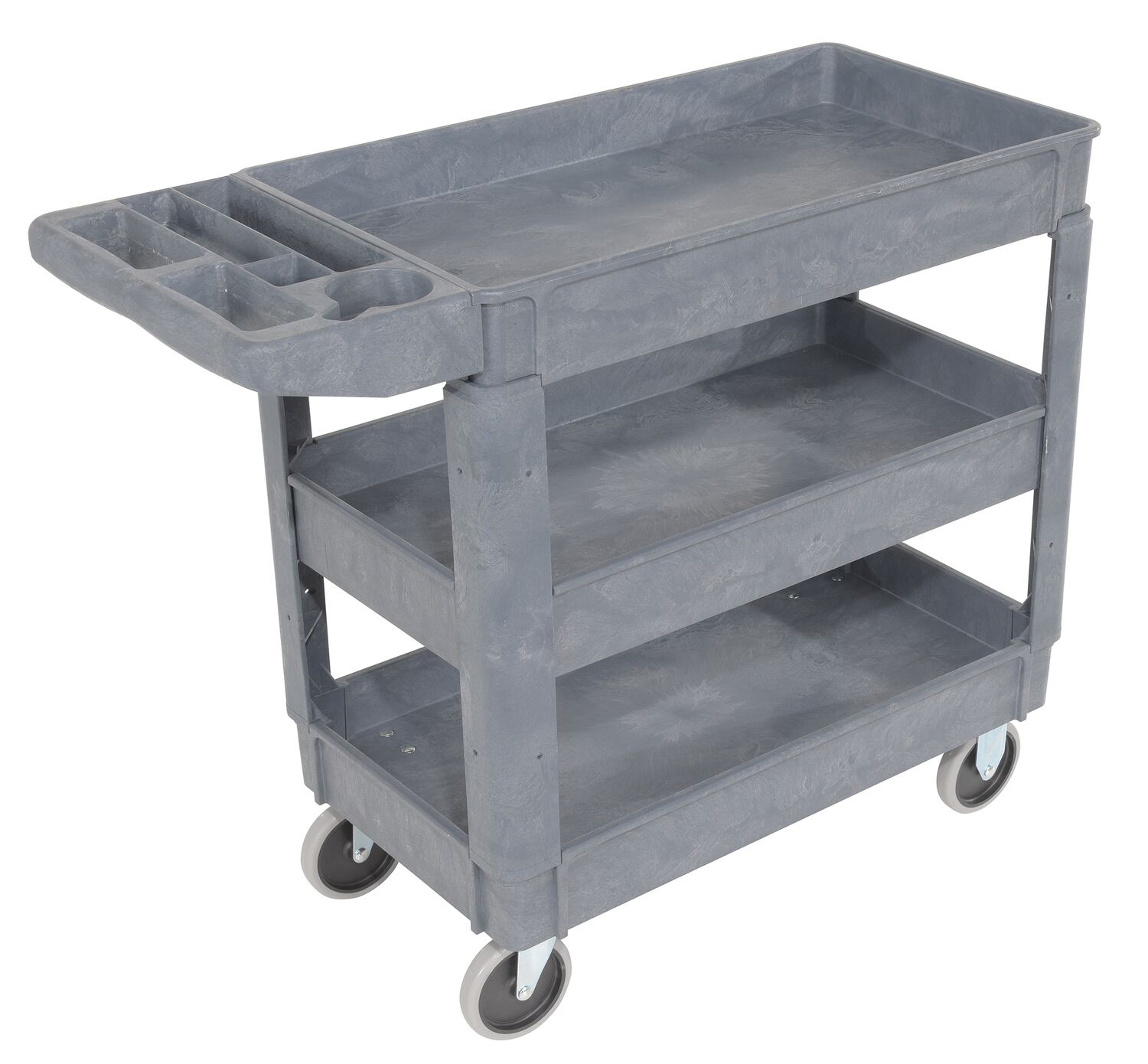 Plastic Utility Service Cart 3 Shelves 40 In. x 18-1/2 In. x 33-1/2 In. 550 Lb. Capacity GrayThis plastic utility service cart is constructed from durable yet lightweight structural foam plastic. Choose the three (3) shelf design to accommodate your application. Deep lips prevent parts from rolling off. Ideal for mail rooms, shipping docks, grocery stores, warehouses, and inventory rooms.