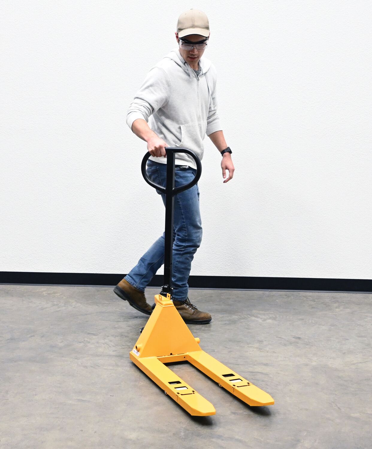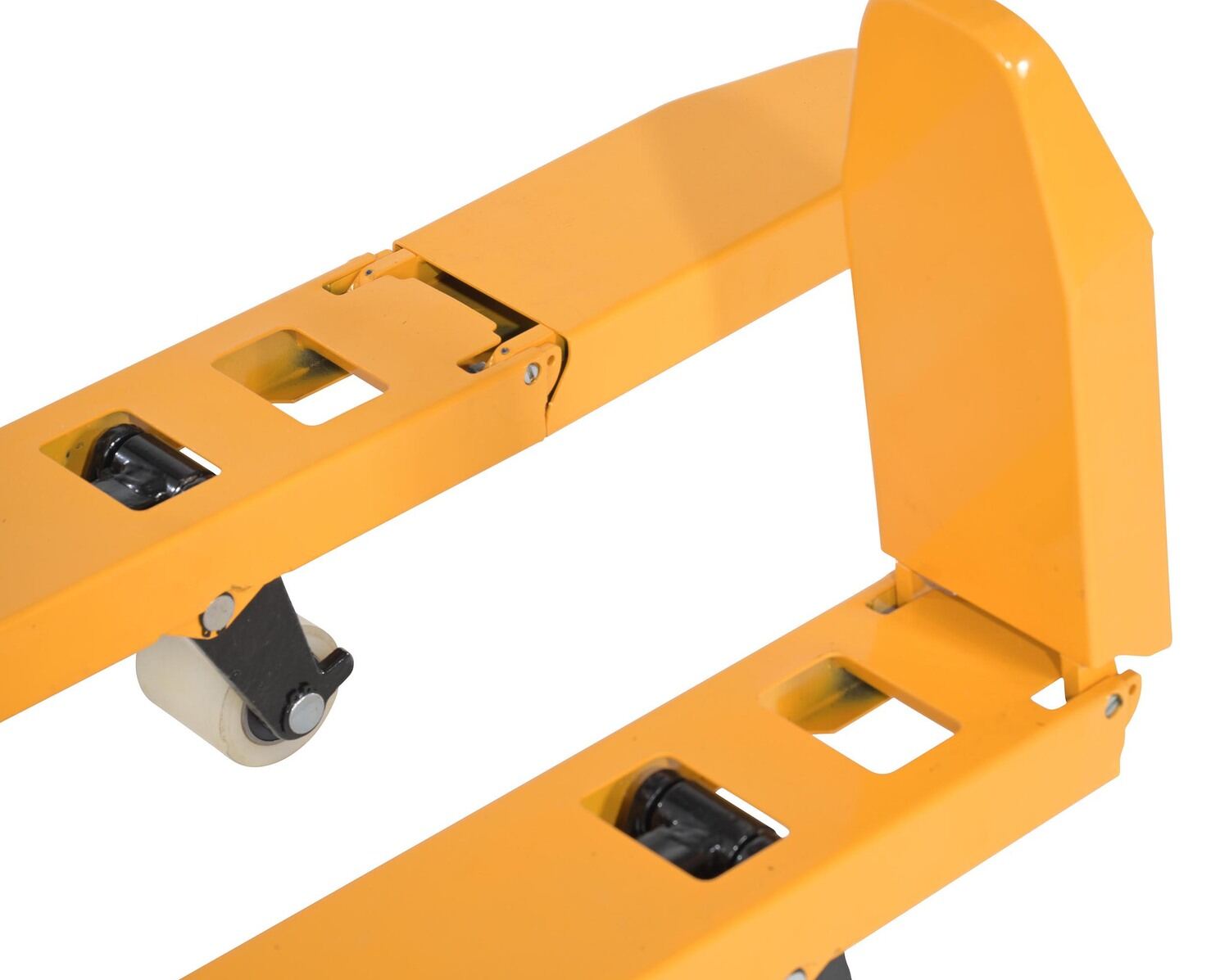 Steel Mini Hand Pallet Truck Fold Down 45 In. x 15 In. x 45 In. 1100 Lb. Capacity YellowJust when it seemed the mini pallet truck couldn't get any smaller, they found a way to make it even more compact! At first glance the overall design may appear to be unchanged, but the features are hidden in plain sight. Not only does the handle now fold down, but the fork tips fold up and back. To better secure the handle in the down position, pre-drilled mounting holes are provided to connect the handle to a welded on bracket. While some things have changed, the always dependable powder coated steel construction has remained. With floor space continuously at a premium, the mini pallet truck is destined to be any facilities go-to pallet truck!