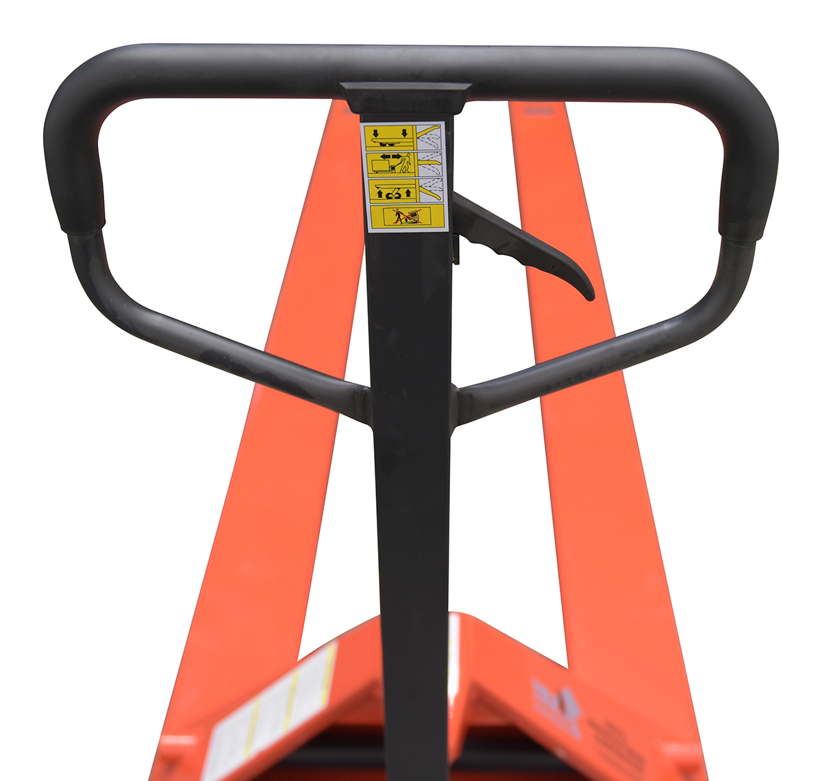 The full featured pallet truck is an economical way for one person to move heavy pallet loads without the use of a fork truck! Includes two (2) articulating steering wheels and two (2) front load rollers. The ergonomic design requires only seventy-five (75) pounds of pulling force when fully loaded. Steering wheels include bearing dust covers for added life. Nose wheels are located on the front edge of each fork to assist in clean pallet entrance and exit. Reinforced triple-formed steel forks provide twice the strength of standard single-formed forks. The unit is equipped with internally mounted solid steel adjustable push rods. The spring loaded handle automatically returns to vertical position when not in use. Hydraulic pump design facilitates easy-access seal replacement. Chrome-plated hydraulic pump piston for long seal life.