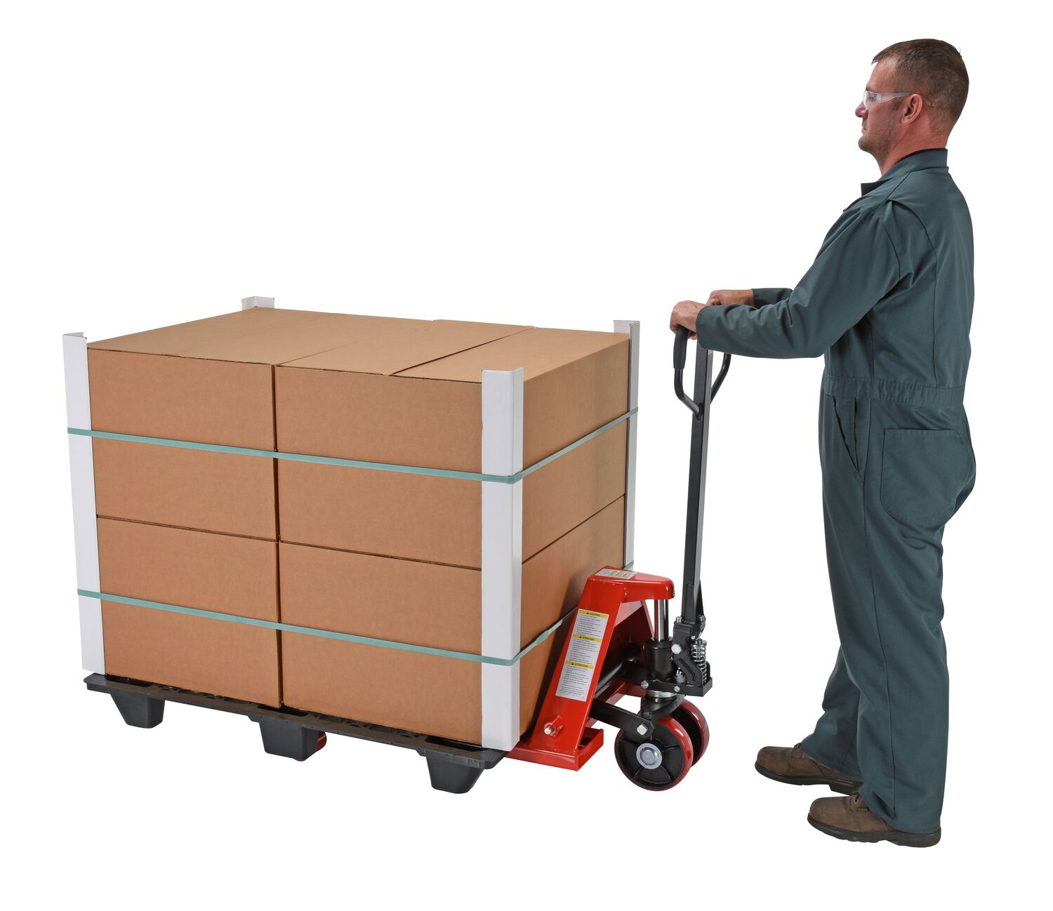 Steel Full Featured Pallet Truck 49-1/2 In. x 27 In. x 48-1/2 In. 5500 Lb. Capacity RedAn economical way for one person to move heavy pallet loads without the use of a fork truck! Includes two articulating steering wheels and two front load rollers. Ergonomic design requires only 75 pounds of pulling force when fully loaded. Steering wheels include bearing dust covers for added life. Nose wheels are located on the front edge of each fork to assist in clean pallet entrance and exit. Reinforced triple-formed steel forks provide twice the strength of standard single-formed forks. Forks are 6." wide each. Equipped with internally mounted solid steel adjustable push rods. Spring loaded handle automatically returns to vertical position when not in use. Hydraulic pump design facilitates easy-access seal replacement. Chrome-plated hydraulic pump piston for long seal life.