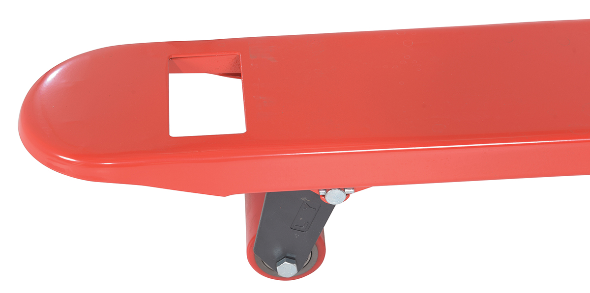 The full featured pallet truck is an economical way for one person to move heavy pallet loads without the use of a fork truck! Includes two (2) articulating steering wheels and two (2) front load rollers. The ergonomic design requires only seventy-five (75) pounds of pulling force when fully loaded. Steering wheels include bearing dust covers for added life. Nose wheels are located on the front edge of each fork to assist in clean pallet entrance and exit. Reinforced triple-formed steel forks provide twice the strength of standard single-formed forks. The unit is equipped with internally mounted solid steel adjustable push rods. The spring loaded handle automatically returns to vertical position when not in use. Hydraulic pump design facilitates easy-access seal replacement. Chrome-plated hydraulic pump piston for long seal life.