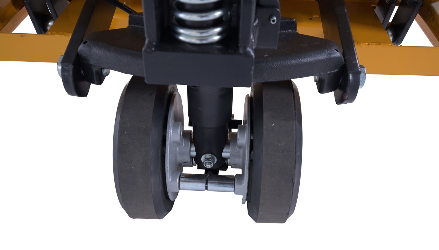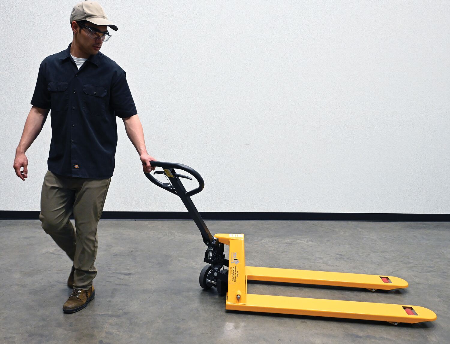 Pallet Truck with Dead Man Brake 66 In. x 27 In. x 49 In. 5500 Lb. Capacity YellowThe pallet truck with hand brake option only moves when you depress the hand brake.