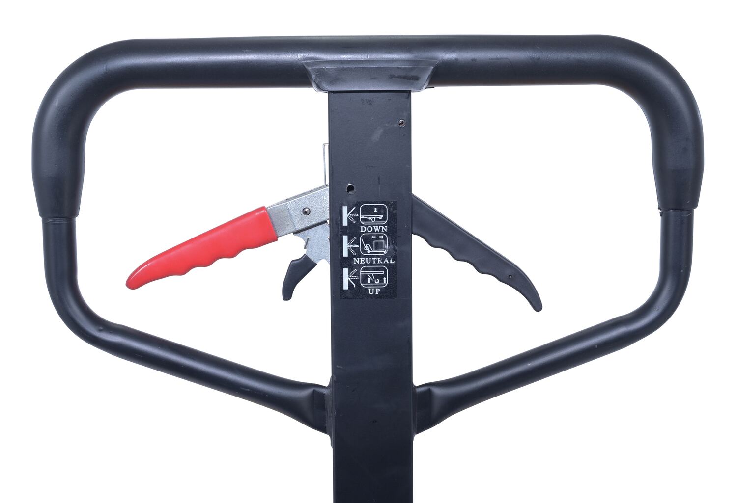 The Ergonomic power assist pallet truck is for anyone who has operated a fully loaded pallet truck and knows the most strenuous part is getting the wheels to start rolling. This pallet truck solves this back breaking problem. Pumping the handle of the pallet truck serves two purposes. First, it serves the traditional purpose of lifting the forks. Second, switch the power drive accumulator and by pulling the handle back, the pallet truck begins to roll automatically, thus reducing the pulling force.