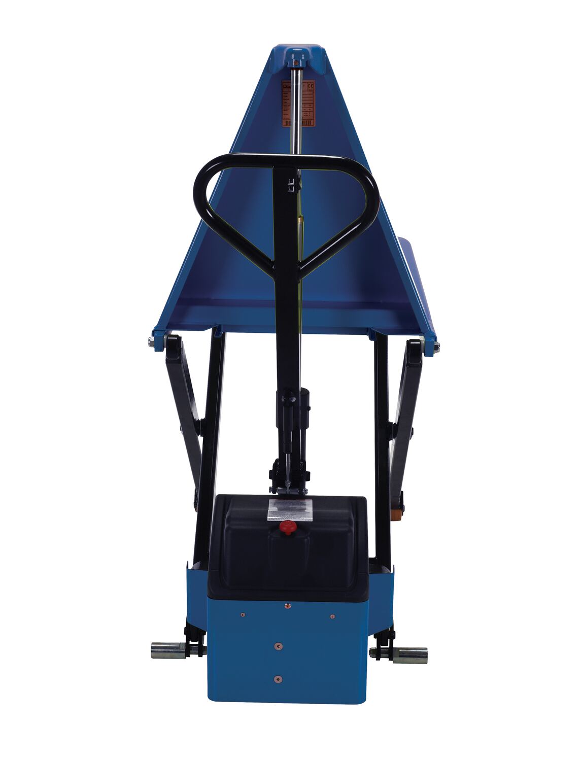 Steel Pramac DC Powered High Lift Pallet Truck 67 In. x 26-1/2 In. x 49-1/2 In. 2200 Lb. Capacity Blue/BlackThe portable high rise pallet lifter is ideal for the packaging and stocking departments. The unit is constructed of steel for strong support and durability during day to day use. The green color lends itself to clear visibility from across crowded workplaces. A push button can be utilized to cut off functionality of the pallet lifter in the case of an emergency. To use, simply slide forks of the unit through the pallet openings and lift to desired height.