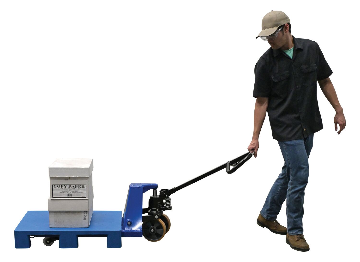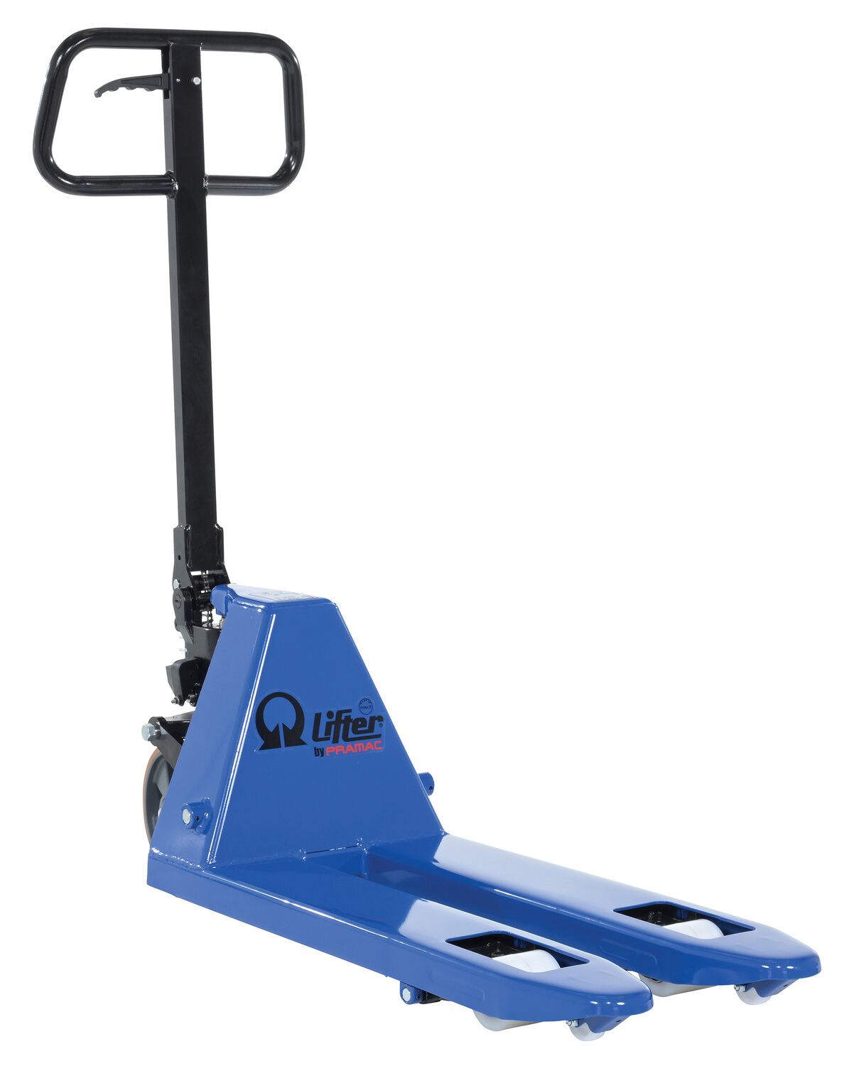 Steel Pramac Mini Hand Pallet Truck Hand Pump 46 In. x 15-3/4 In. x 46 In. 5500 Lb. Capacity Blue/BlackThe mini hand pallet truck is ideal for shipping and dock personnel. The pallet truck is designed of steel for resistance against damage throughout day to day use. A bright finish allows the units to be visible to other personnel, both near and far. The extended steering handle creates a more ergonomically friendly position while distributing products from work area to work area.