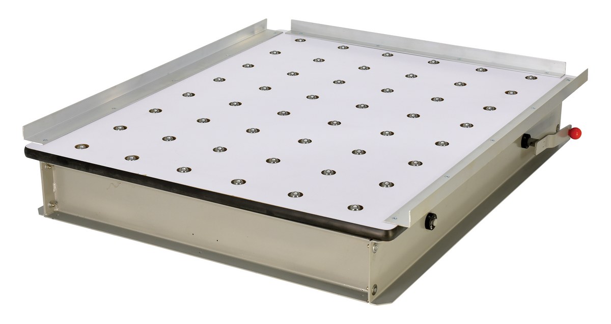 The "pop-up" ball transfer platform is an economical way to increase usable height and product manipulation to any cart or table. A ball retraction handle is conveniently located on the side to secure load. Can be mounted to scissor carts or post tables.
