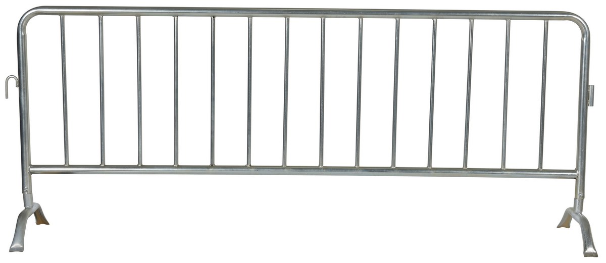 Steel Heavy Duty Crowd Control Interlocking Barrier with Curved Feet 101-3/4 In. Length SilverThe Heavy Duty crowd control interlocking barrier is attractive and the functional design is ideal for directing personnel. Interlocking portable railing has many commercial and industrial applications. Easy to move to meet changing needs. Upright bars are vertically spaced. Each railing includes connectors to attach multiple units together to form long runs. Feet are removable so railing will lay flat for shipping and storage.