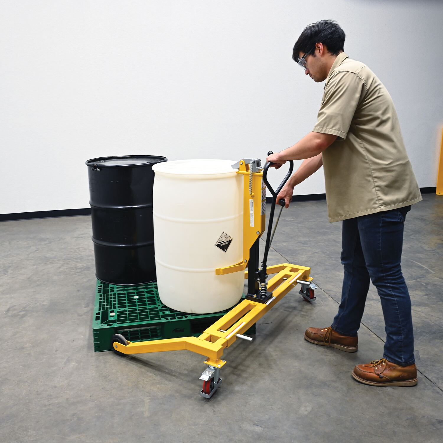 Steel Pallet Straddling Drum Truck 46 In. Long x 32 In. Wide x 47 In. Height 550 Lb. Capacity YellowA single operator can engage, lift and transport drums stored either on the center of pallets or the corner of containment skids with this pallet straddling drum truck. Works with steel drums. To engage a drum, the truck uses a rim clamp that securely grasps the top lip of the drum. Wheels provide a high degree of maneuverability; each swivel wheel is protected by guards and is equipped with brakes.