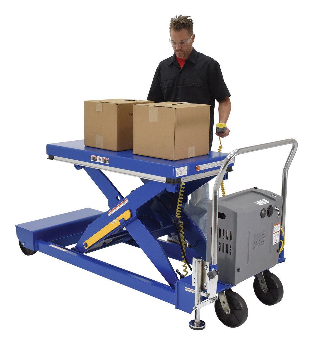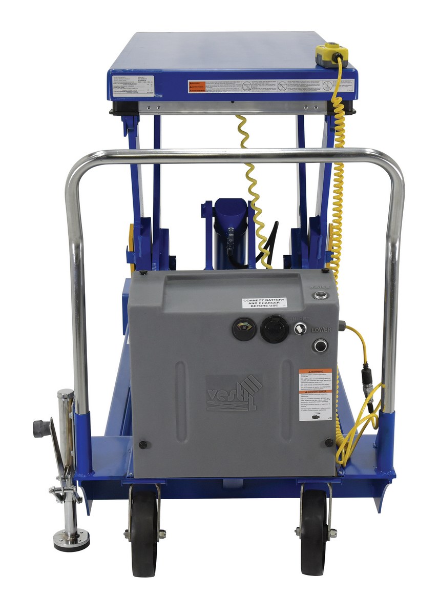 Steel Heavy Duty Portable Scissor Lift Table 24 In. x 48 In. 3000 Lb. Capacity BlueHeavy Duty portable lift scissor tables can easily transport and elevate heavy loads. Featuring glass nylon filled casters (2 swivel and 2 rigid), floor lock, patented electric pinch point guards, and magnetic hand controls. Key-operated on/off control for better security is built into the power unit. Heavy duty 12V DC powered unit with deep cycle battery, an on-board battery charger and battery charge indicator gauge comes standard.