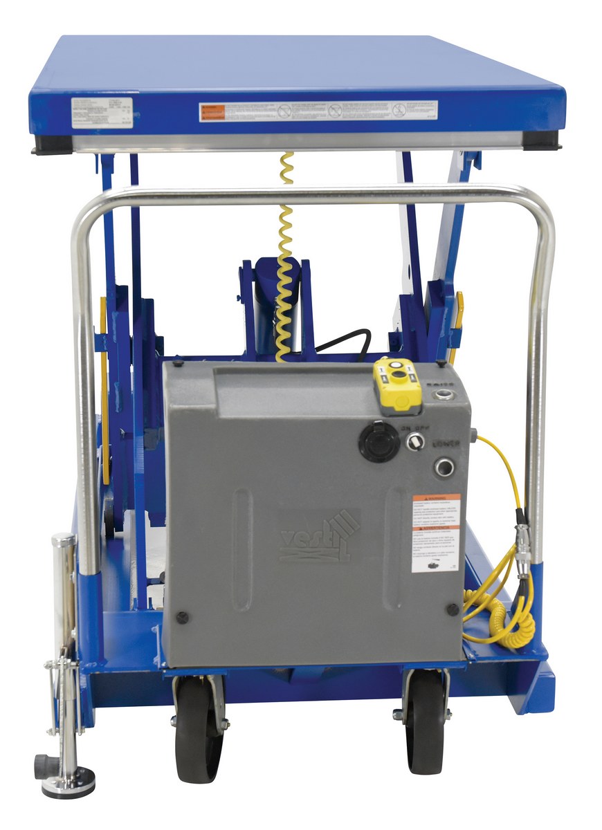Heavy Duty portable lift scissor tables can easily transport and elevate heavy loads. Featuring glass nylon filled casters (2 swivel and 2 rigid), floor lock, patented electric pinch point guards, and magnetic hand controls. Key-operated on/off control for better security is built into the power unit. Heavy duty 12V DC powered unit with deep cycle battery, an on-board battery charger and battery charge indicator gauge comes standard.