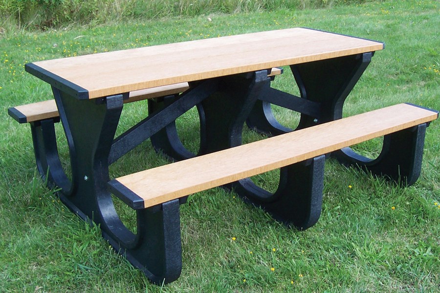 Recycled Plastic Picnic Table Rectangle Walk Thru 28 In. x 72 In. 2000 Lb. Capacity Black Leg Cedar TopThe recycled plastic picnic tables are great for both recreational and commercial uses. The surfaces are resilient to adverse environments that arise throughout the year. The strong lightweight construction makes it easy to move from one location to another. The seat layout is easily accessible. ADA designs are also available.