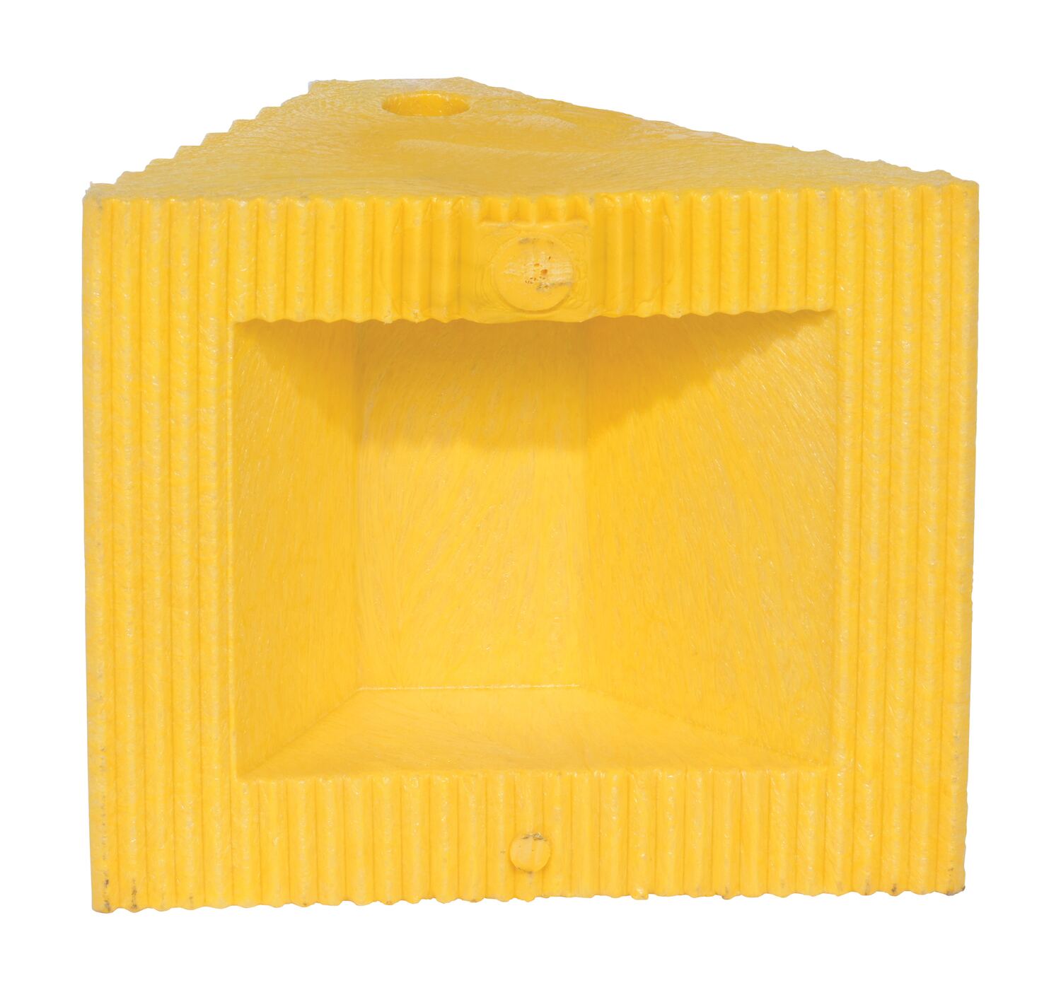Recycled Plastic Dual Slope Wheel Chock 10-11/16 In. x 9-1/4 In. x 6 In. YellowFeatures a dual slope. One side has a 45 degrees slope while the other side has a 60 degrees slope. 100% Recycled plastic construction is chemical and sunlight resistant and delivers a strong grasp to a number of surfaces. Features a thru hole to accommodate chain attachment.