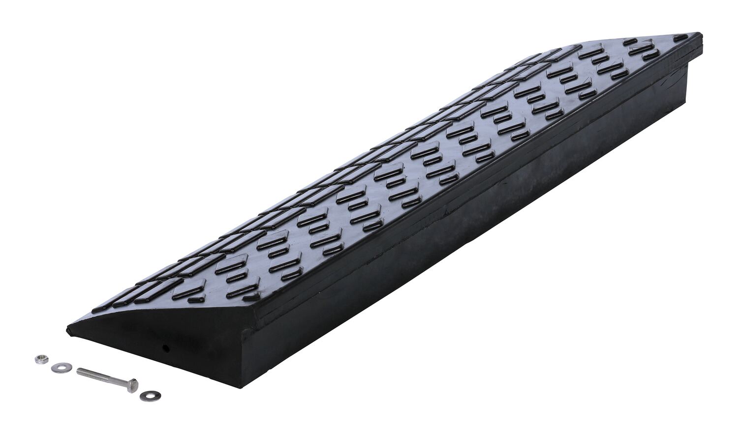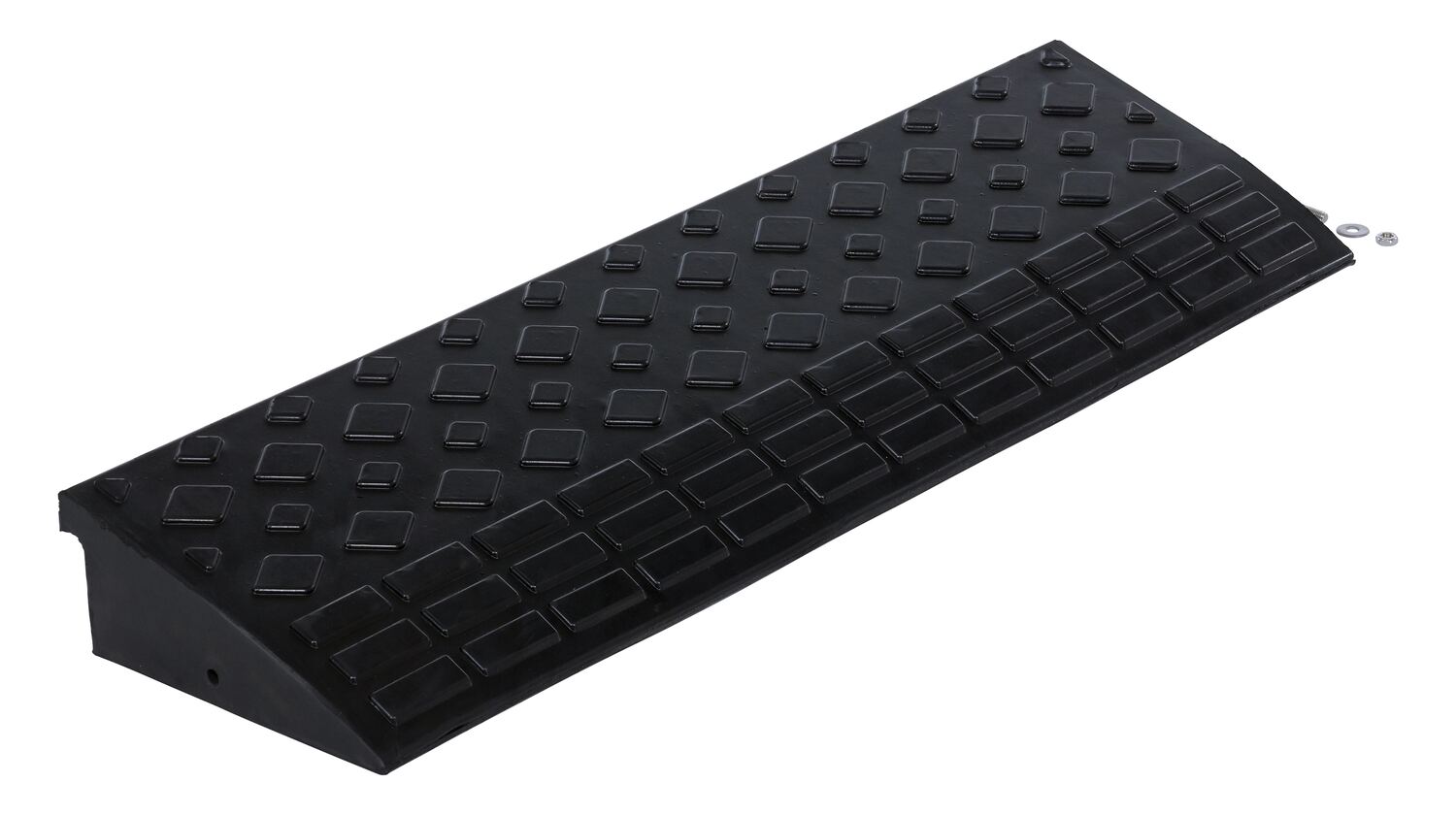 The rubber ramp consists of modular rubber that is versatile for use in many applications. Add round corner piece (sold separately) for a finished look. Tread surface pattern for better traction. Includes hardware for connecting ramps together. Heavy-duty molded rubber construction.