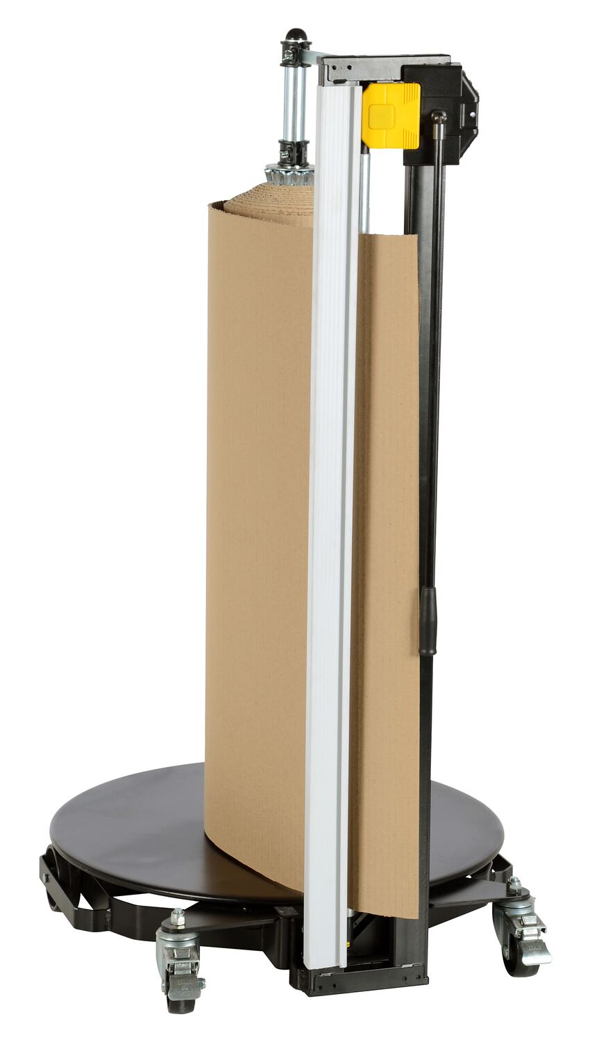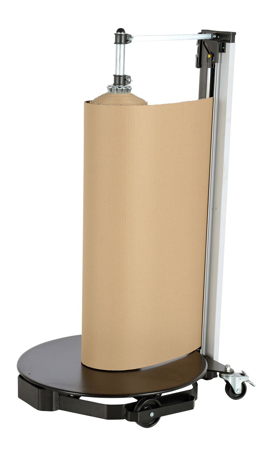 The unique portable roll dolly is designed for moving, holding, and dispensing rolls of material right where they are needed. Integral turntable easily rotates on ball bearings to allow for dispensing. Upright post detaches to allow for easy loading of larger rolls. Portable on lockable swivel casters steel construction and powder coat finish.