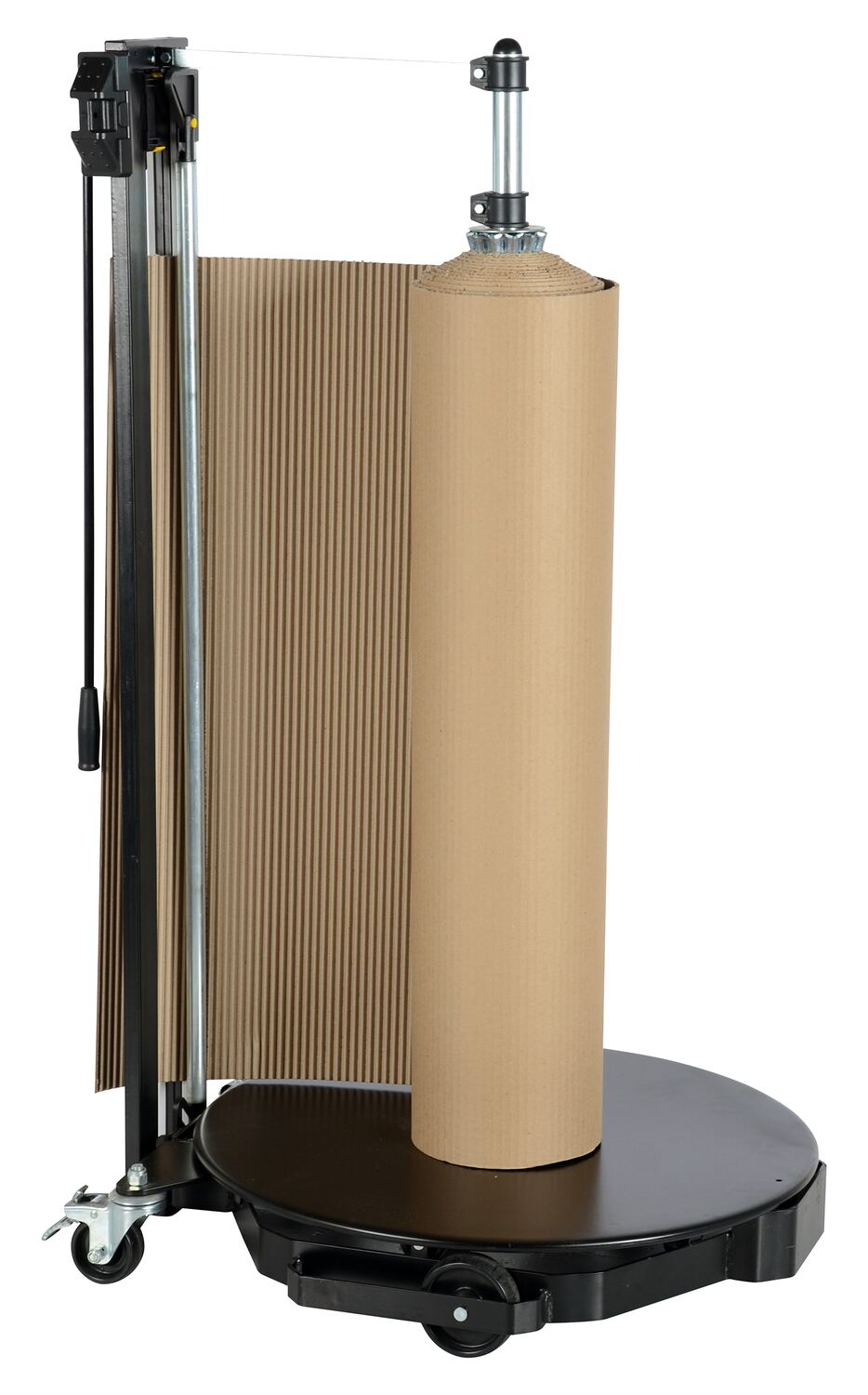 Steel Roll Dolly with Cutter 40 In. x 35 In. x 70 In. 440 Lb. Capacity BlackThe unique portable roll dolly is designed for moving, holding, and dispensing rolls of material right where they are needed. Integral turntable easily rotates on ball bearings to allow for dispensing. Upright post detaches to allow for easy loading of larger rolls. Portable on lockable swivel casters steel construction and powder coat finish.