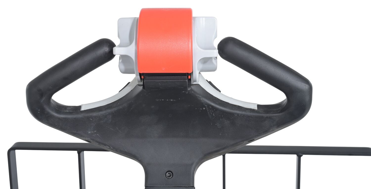 An all-terrain pallet truck is the perfect outfit for moving heavy loads over a variety of landscapes. The simple functionality of the unit allows the user to maneuver the truck, both loaded and loaded, easily. Driving handle is centrally located with functions both on and underneath the handle, located directly on the front console. Functions include an easy to operate throttle with infinite adjustment of forward/reverse speeds, lift/lower controls, emergency reverse-function and horn. Emergency reverse belly switch instantly reverses direction and moves the unit forward (away from the operator). Forks are adjustable to best fit the users needs.